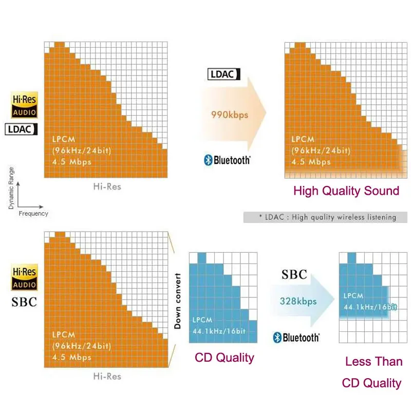 SONY LDAC: LDAC Поддерживает потоковое аудио высокого разрешения через bluetooth-соединения до 990 кбит/с (выше aptX и aptX HD), делает его стандартом codec, который обеспечивает высококачественную беспроводную Потоковую передачу звука для устройств Android. Также поддерживает AAC, самый продвинутый кодек для устройств iOS/Apple.