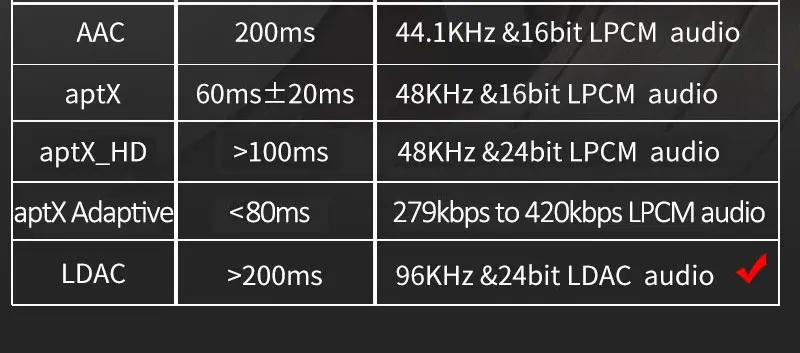 3. Сильный формат декодирования делает качество звука намного лучше: LDAC, aptX Adaptive, aptX HD, aptX, AAC, SBC