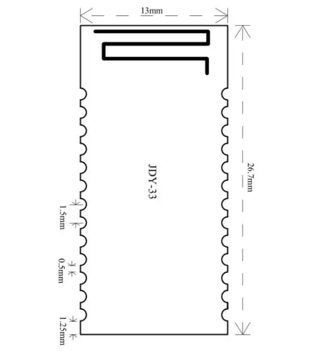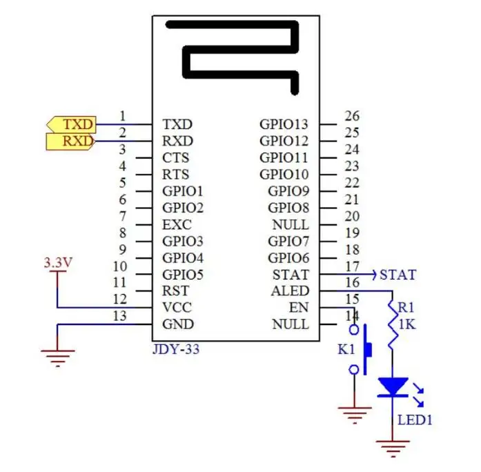 JDY-33 обычному приложению необходимо только подключить 4 контакта VCC, GND, RXD, TXD, если он отключен в подключенном состоянии, отправьте диск + r, И нужен глубокий сон в несоединенном состоянии, чтобы отправить в + сон, после глубокого сна, Вы можете проснуться через падающую кромку EN pin, или вы можете отправить данные через последовательный порт, чтобы проснуться. Обычно рекомендуется использовать последовательный порт для отправки команды AT + VERSION \ r для пробужденияОписание контактной функции:TXD: Серийный выходной штырь (TTL уровень)RXD: Серийный входной штырь (TTL уровень)CTS: последовательный контроль потока CTS pinRTS: последовательный порт управления потоком RTS pinGPIO1: функция по умолчанию отсутствует (может быть настроена в соответствии с входом клиента и выходом IO управления)GPIO2: функция по умолчанию отсутствует (может быть настроена в соответствии с входом клиента и выходом IO управления)EXC: функция по умолчанию отсутствует (может быть настроена в соответствии с входом клиента и выходом IO управления)GPIO3: функция по умолчанию отсутствует (может быть настроена в соответствии с входом клиента и выходом IO управления)GPIO4: функция по умолчанию отсутствует (может быть настроена в соответствии с входом клиента и выходом IO управления)GPIO5: функция по умолчанию отсутствует (может быть настроена в соответствии с входом клиента и выходом IO управления)RST: сброс (активный низкий)VCC: источника питания (1,8-3,6 V)GND: наземныйNULL:-RU: входная булавка, используемая для пробуждения от сна (допустимая опускающаяся кромка)ALED: вывод статуса трансляции (вспышка не подключена, выход высокого уровня после подключения)STAT: штырь состояния подключения (низкий уровень не подключен, высокий уровень выхода после подключения)GPIO6: функция по умолчанию отсутствует (может быть настроена в соответствии с входом клиента и выходом IO управления)GPIO7: функция по умолчанию отсутствует (может быть настроена в соответствии с входом клиента и выходом IO управления)NULL:-GPIO8: функция по умолчанию отсутствует (может быть настроена в соответствии с входом клиента и выходом IO управления)GPIO9: функция по умолчанию отсутствует (может быть настроена в соответствии с входом клиента и выходом IO управления)GPIO10: функция по умолчанию отсутствует (может быть настроена в соответствии с входом клиента и выходом IO управления)GPIO11: функция по умолчанию отсутствует (может быть настроена в соответствии с входом клиента и выходом IO управления)GPIO12: по умолчанию нет функции (может быть настроен в соответствии с входом и выходом клиента IO управления)GPIO13: по умолчанию нет функции (может быть настроен в соответствии с входом и выходом клиента IO управления)Размер:
