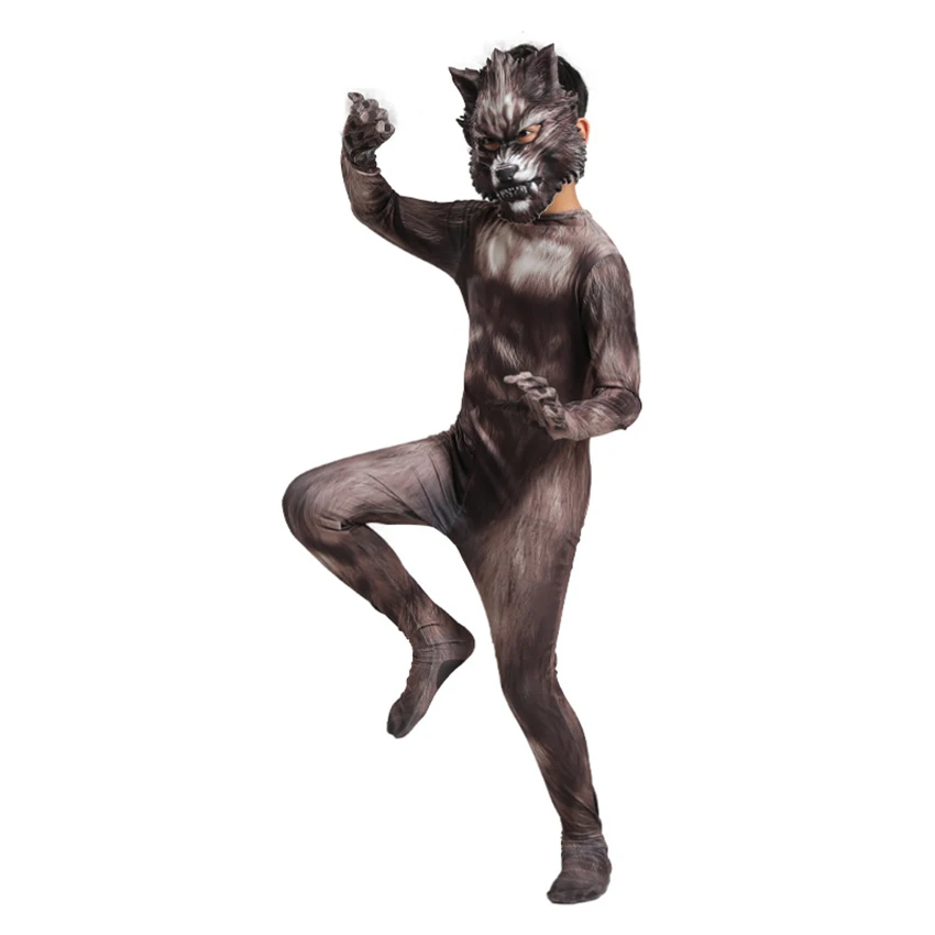 Аниме-страшный пушистый костюм для косплея оборотня, костюмы на Хэллоуин для детей, зентай, монстр, волк, маска, головной комбинезон, маскировка, детское платье