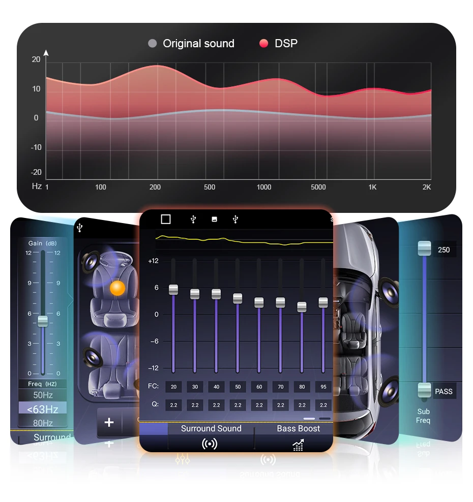 3. Регулировка выходного сигнала сабвуфера для улучшения ритма музыки и устранения усталости при вождении.