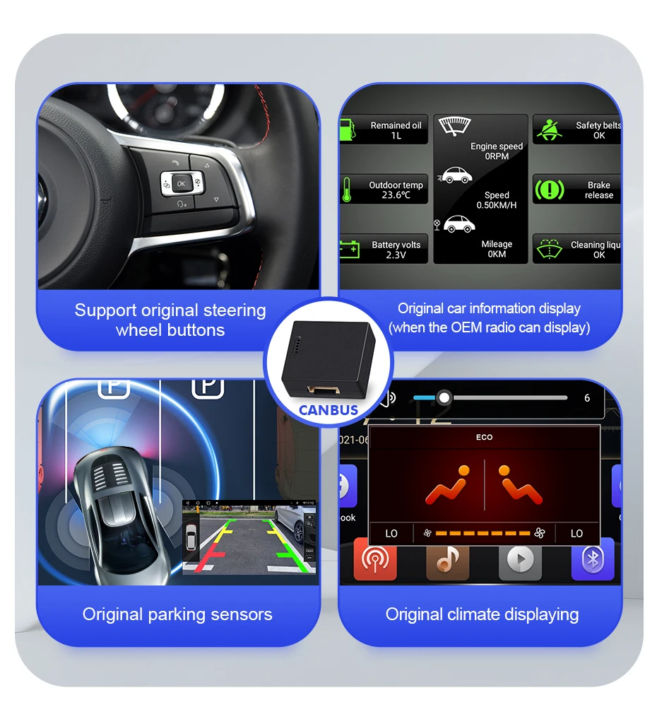 Поддержка управления рулевым колесом, информация о автомобиле, кондиционер и оригинальный датчик парковки. (Если оригинальное радио не может отображать информацию о автомобиле, наше радио не может ее отобразить)