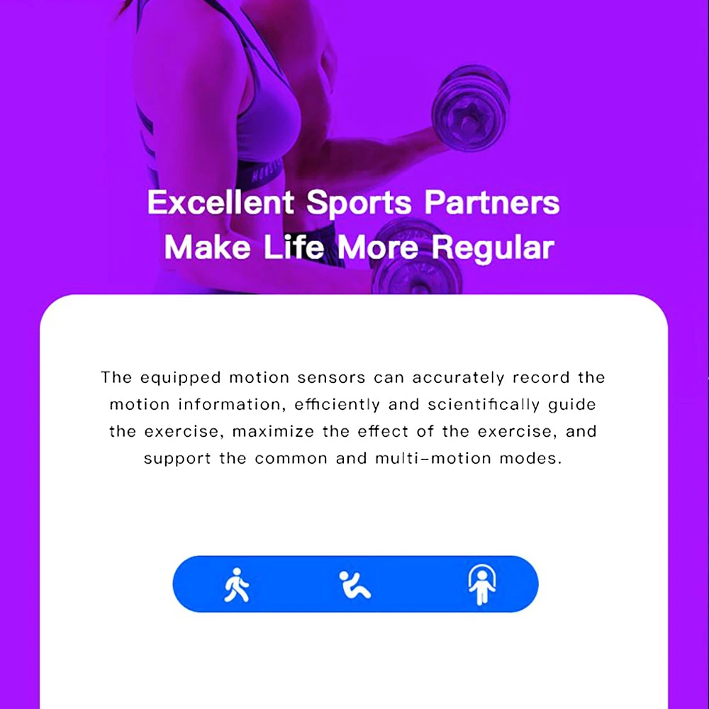 1. Датчик движения: Оснащен датчиком движения, который точно записывает информацию о упражнениях, эффективно и научно руководит упражнениями, максимизирует эффект упражнений и поддерживает нормальный режим и режим мульти-спорта.