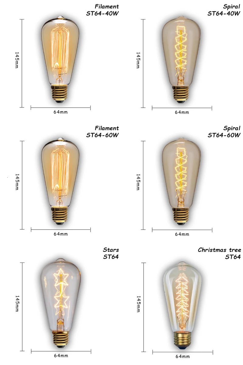Патрон E27: ST64/A19/T45/G80/G95/G125/T10/T30/ST64-Tree/L85/ST58/A19-Star E14 патрон: ST48/C35-J/C35-L