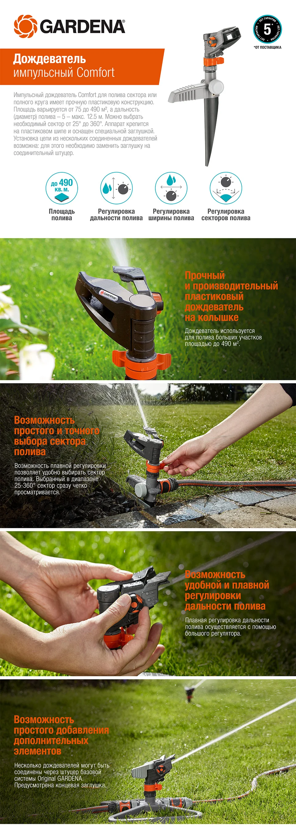 Дождеватель секторно-круговой импульсный Comfort имеет прочную пластиковую конструкцию. Дальность полива регулируется с помощью большого и удобного регулятора и может варьироваться от 5 до 12,5 метров. Возможен полив участка площадью от 75 до 490 м2.
