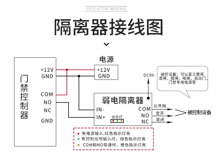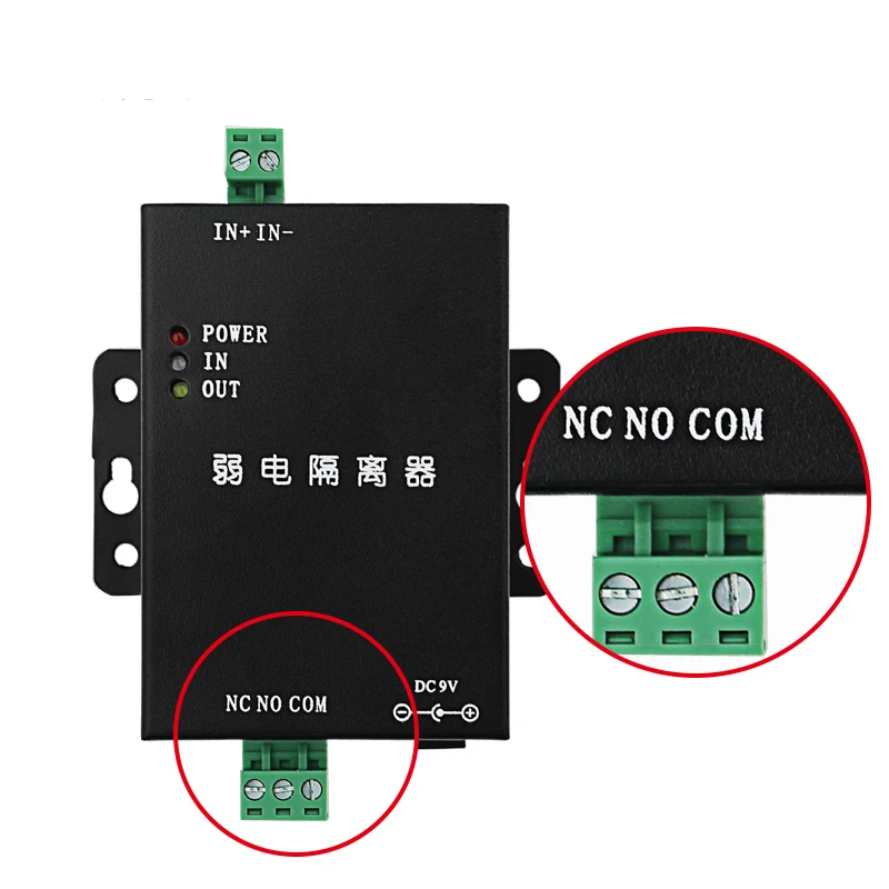 Внешнее оборудование большого тока, как барьер, роликовые ворота, двери автоматизации и колокол и т. Д., будет генерировать огромные помехи, когда контроллеры доступа подключаются к этим продуктам неэлектрических ударов. Это повлияет на оборудование контроллера. Изолятор слабого тока использует передовую технологию многоуровневой и двойной изоляции, может изолировать все помехи и поддерживать стабильную работу системы в течение длительного времени.