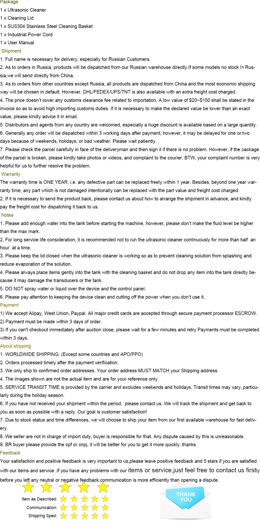 Примечание: Когда вы покупаете ультраосническую чистку, какие части вам нужно очистить, такие как удаление масла, удаление пятен, удаление ржавчины и т. д., вам нужно купить подходящую чистящую жидкость для очистки вместе. Пожалуйста, знайте это.