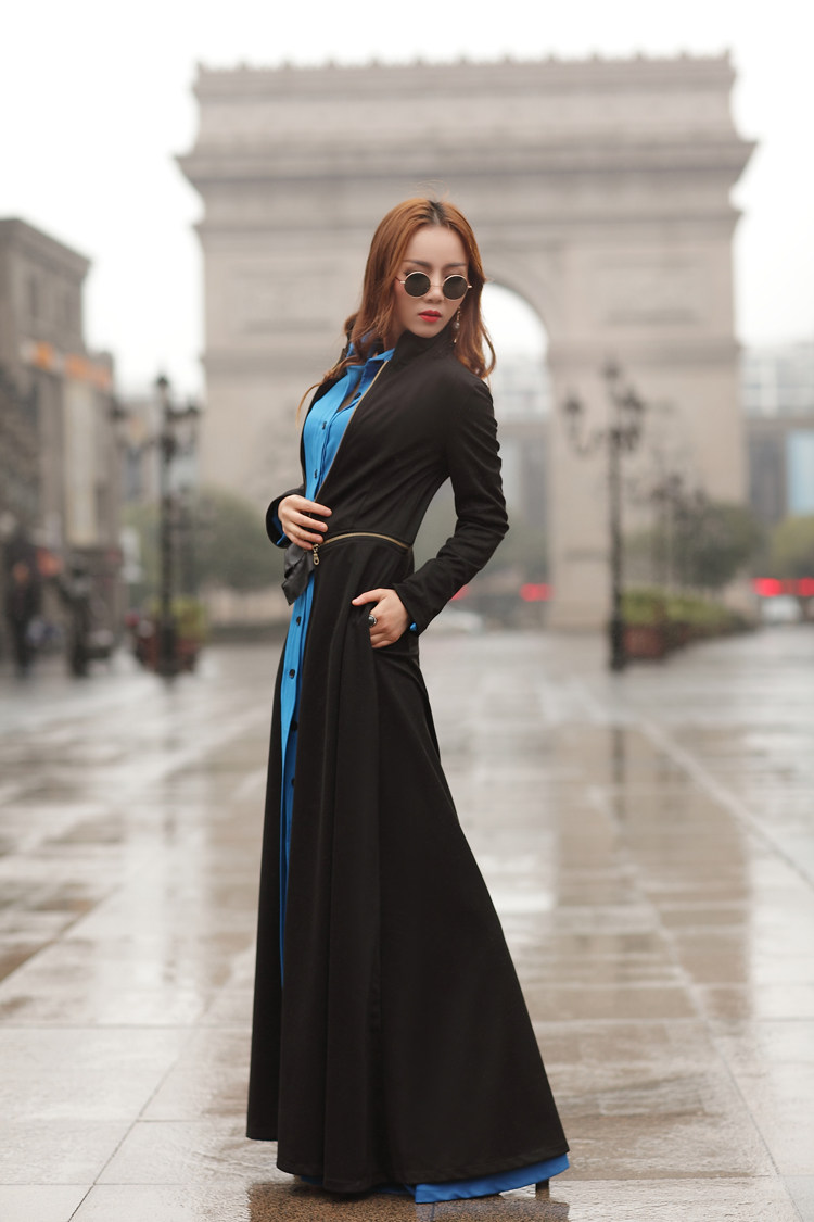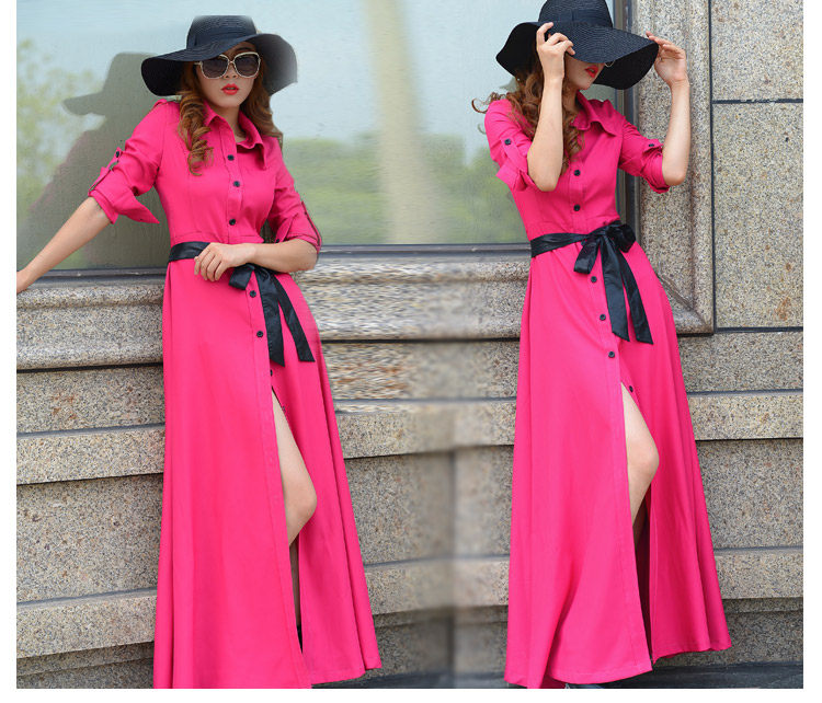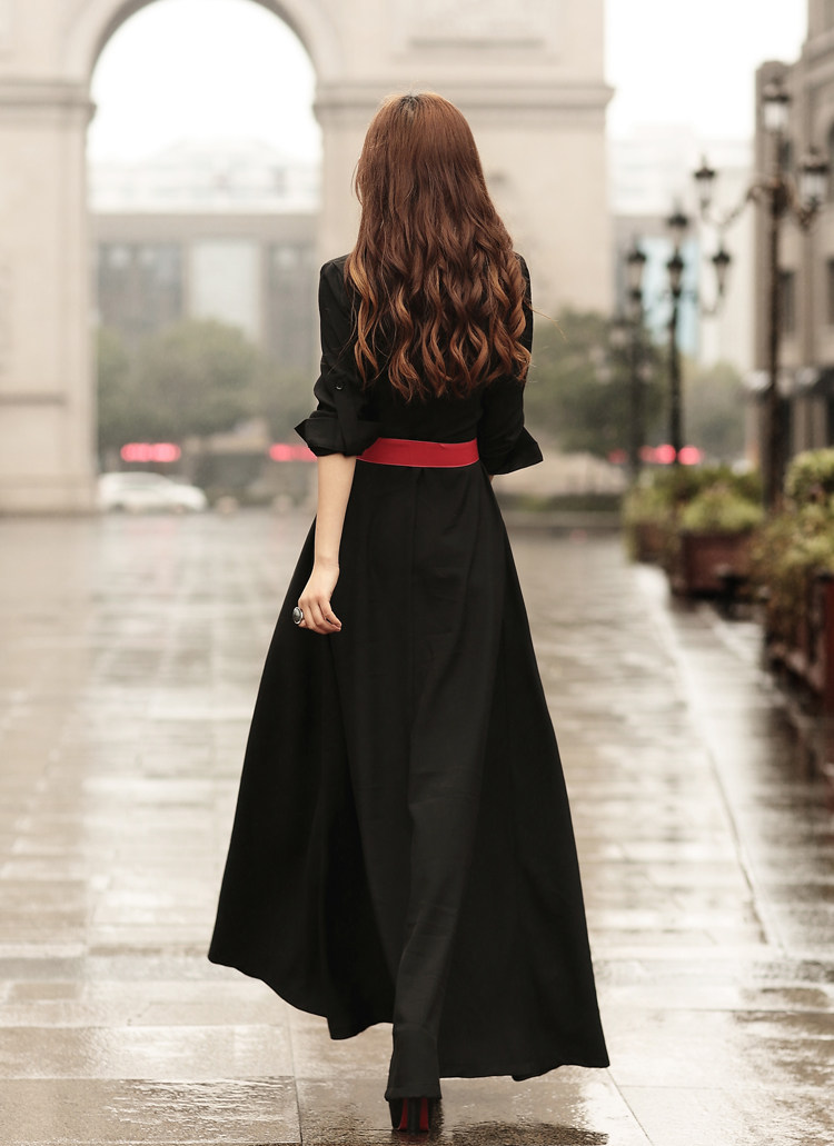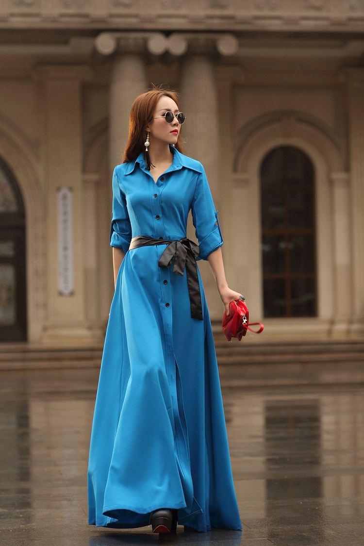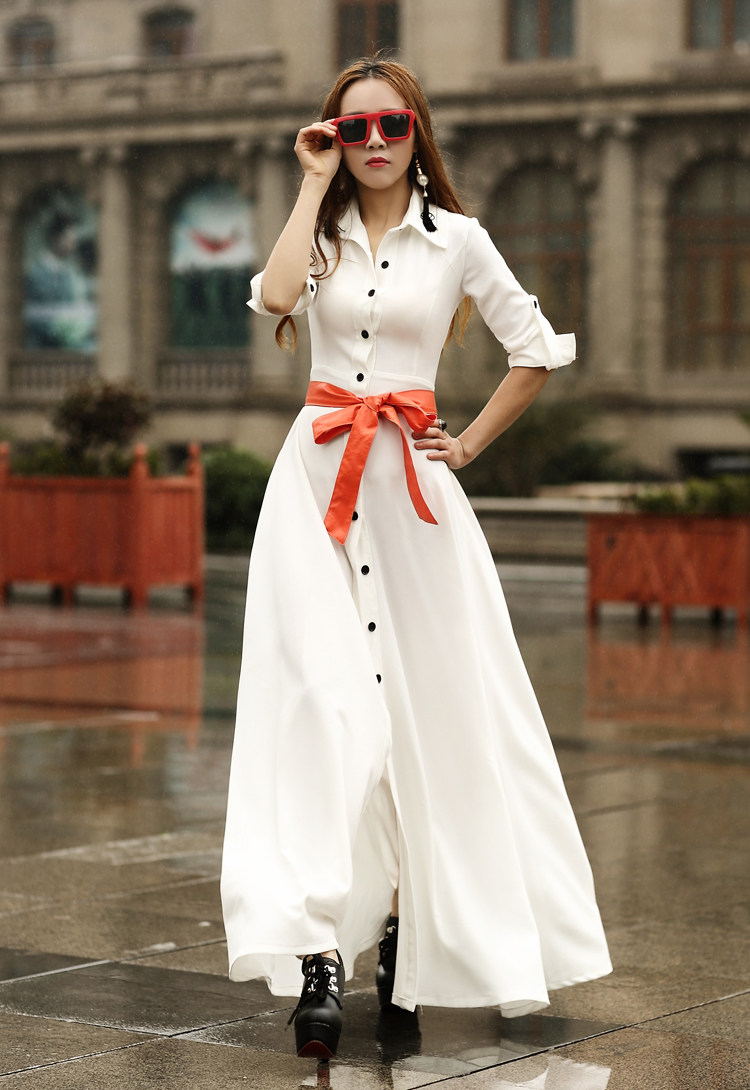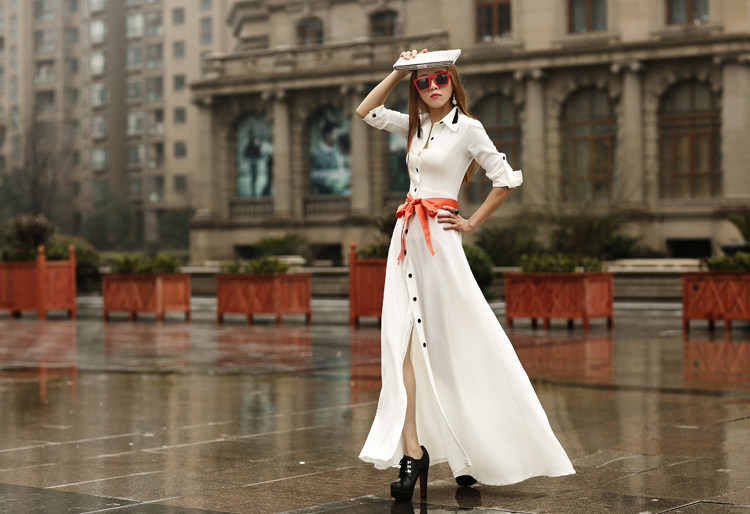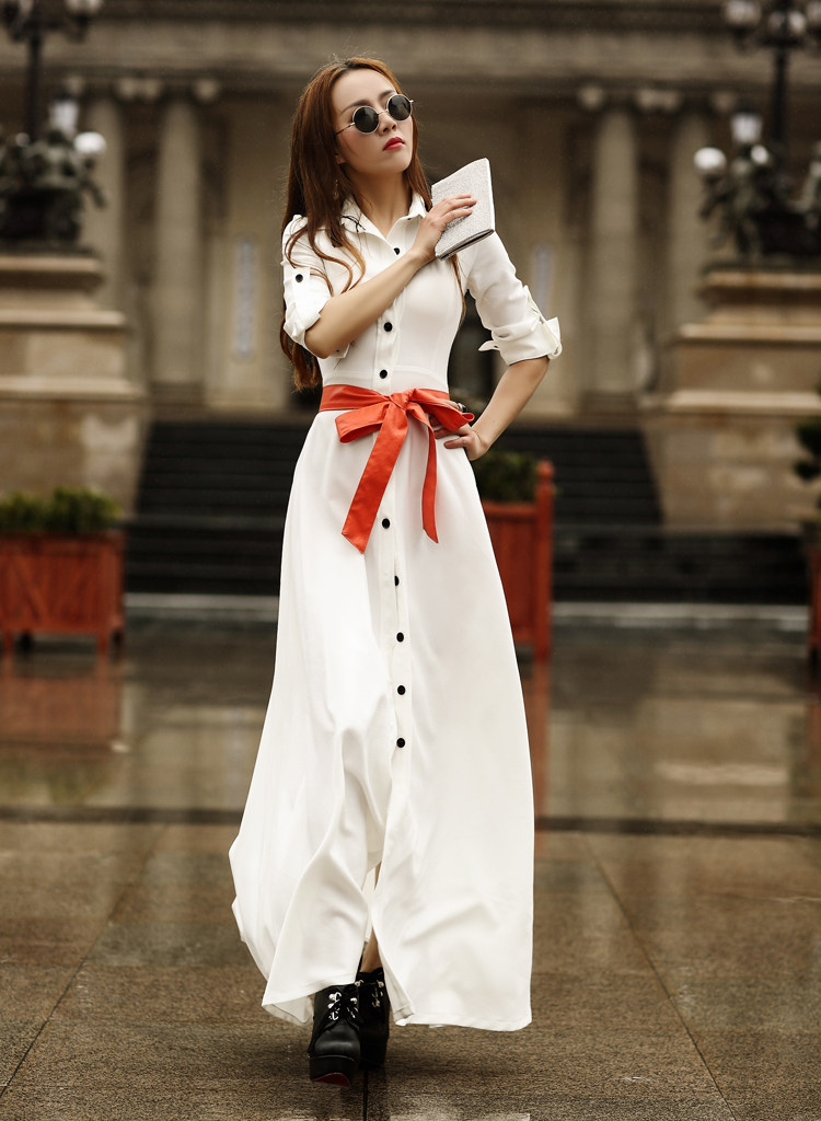 Женщины 2017 Осень-зима мода элегантный пол длина белое платье Длинные рукава базовый ультра длинное платье с поясом