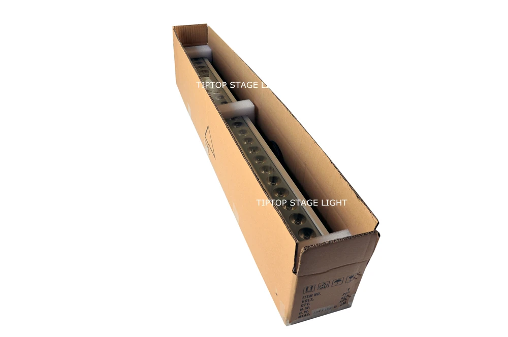 Напряжение: AC90-260V.50-60hz Мощность: 80 Вт Количество светодиодов: 18 шт 4W оригинальные светодиодные лампы tyanshine Испускание цветов: RGBW 4 в 1 смешивание цветов Каналы DMX: 4/8 каналов Угол наклона линзы: 25 градусов (на выбор объектив 45 градусов). Цена такая же. Если нужно, пожалуйста, сообщите нам вовремя) Способ использования: наружный (водонепроницаемый) Функции: DMX. Встроенная программа. Автоматический запуск. Сертификация: CE/ROHS Разъем: вход/выход питания, вход/выход DMX Материалы корпуса: алюминиевый чехол Светильник Длина: 100 см Ширина: 9 см Высота: 12 см Размер упаковки картонной коробки для каждой единицы: 104 см * 16 см * 15 см Вес упаковки для каждой единицы: 5 кг * Стандартный способ упаковки-картонная коробка с пеной. Упаковка бортового чехла не является обязательной Упаковочный лист для каждой единицы: 1 x светодиодный светильник для омывателя стен 1 Руководство пользователя * Мы упакуем водонепроницаемый кабель питания и кабель DMX для заказа.
