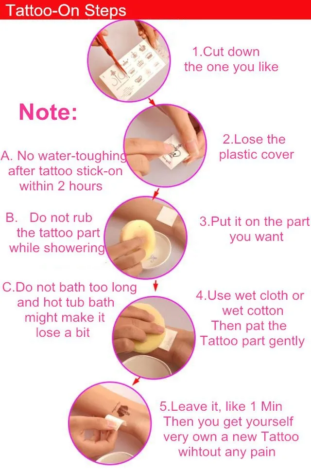 1. Cut out tattoo of choice. 2. Remove clear, protective top sheet. 3. Press tattoo firmly onto clean, dry skin with design face down. 4. Wet tattoo thoroughly using wet sponge or cloth. 5. Peel off paper backing after 30 seconds. Pat dry. 6. Tattoos can be removed by washing with soap and water. To remove tattoos more easily, you can use a drop of body oil.
