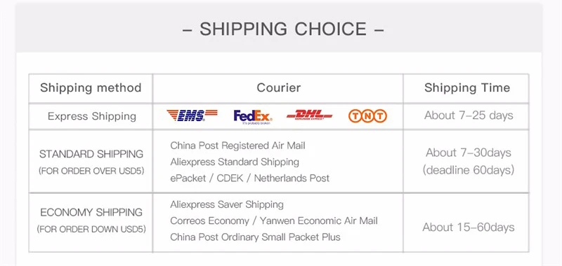 Товар отправляется из Китая авиапочтой и доходит до большинства стран в течение 15–25 рабочих дней.