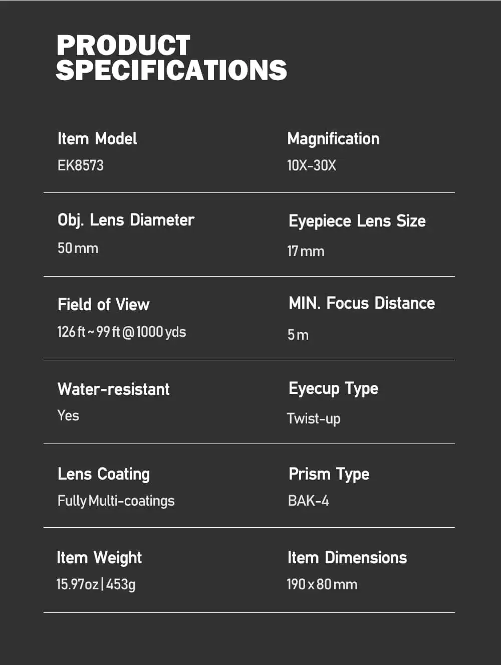 Большое текстурированное фокусирующее колесо и увеличивающий воротник позволяют точно регулировать холодную погоду и во время ношения перчаток. Стандартное крепление штатива 1/4 "-20 Совместимо с большинством штативов и головок для фото/видео/поля, быстроразъемными пластинами и другими поддерживающими системами, такими как Моноподы и оконные крепления. Изогнутые резиновые наглазники для удобного просмотра с очками или солнцезащитными очками. Исключительное 16 мм облегчение глаз при 10х максимизирует комфорт при просмотре с уменьшенным напряжением глаз; Удобное 16,5 мм на 24x. Широкий выходной зрачок 5 мм на 10x оптимизирован для использования на низком светильник для максимального покрытия расширенных зрачков; 1,7 мм на 30x. Детали конструкции Заполнение Азотом и уплотнительное кольцо герметичные, чтобы быть водонепроницаемыми и устойчивыми к внутренней запотеванию при перемещении через экстремальные температурные изменения и условия окружающей среды. Легкий и термостойкий корпус из поликарбоната. Антивибрационное резиновое покрытие защищает корпус, обеспечивая противоскользящее сцепление. Вес: 15,97 унций.В детстве я обожал смотреть мультик по этой вселенной. Каждая битва прям наполняла адреналином и постоянно хотелось почувствовать себя на... Читать отзыв полностью...