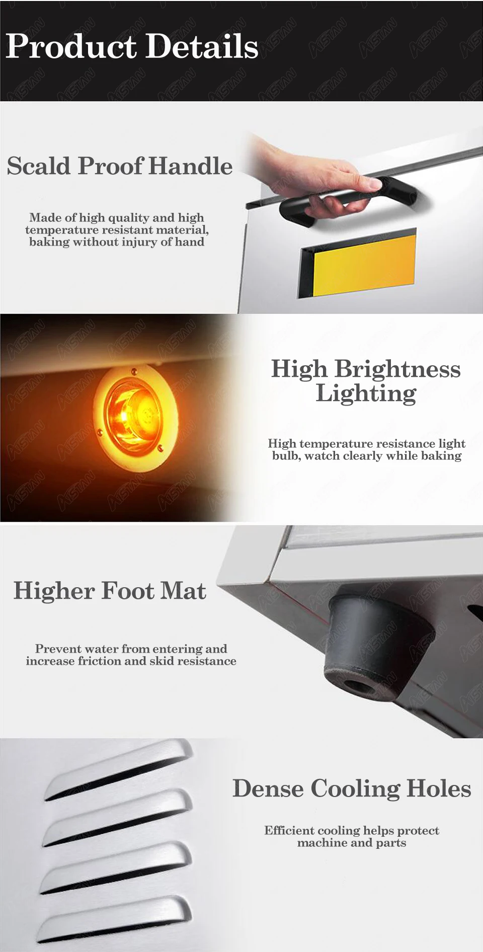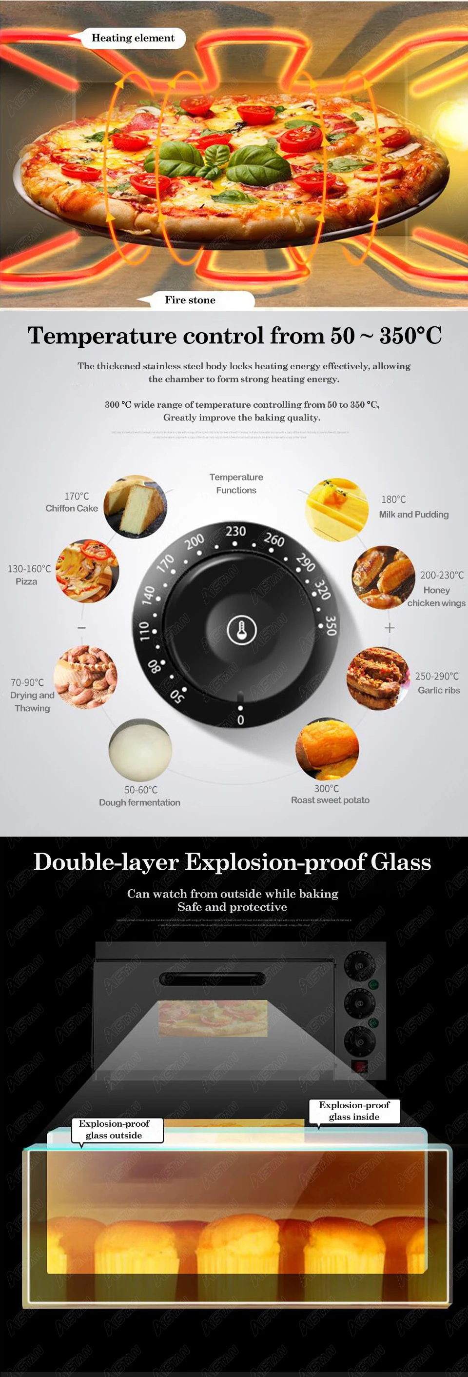 1. Передняя дверь из нержавеющей стали и передняя панель, внутренняя камера с алюминиевым листом горячего погружения, порошковое покрытие. 2. Макс. 350C контроль температуры. Быстрое приготовление пищи в течение 5 минут. 3. Механический термостат контролирует отдельно для верхнего и нижнего нагревательного элемента внутри каждой палубы. 4. Используйте 30-минутную время нагрева для 300 °C температуры. 5. Усиленная дверь для легкого обслуживания и частоты открытия и закрытия. 6. Усиленное окно из закаленного стекла для контроля состояния выпечки пиццы. 7. Длинная галогенная система освещения для лучшей проверки процесса выпечки пиццы. 8. Огнеупорный камень/материал внутренней камеры, нержавеющая сталь и изоляционный материал протестированы RoHS. 9. БЫСТРОРАЗЪЕМНАЯ упаковка с машинным местом на картонной коробке и крышке сильным мультипликационным принтом. 10. Один кусок продольного огненного камня для оператора может один выстрел скольжения в мягкой пиццы без повреждения формы. 11. CE и RoHS Сертификация по Заводской декларации соответствия и самоутверждения