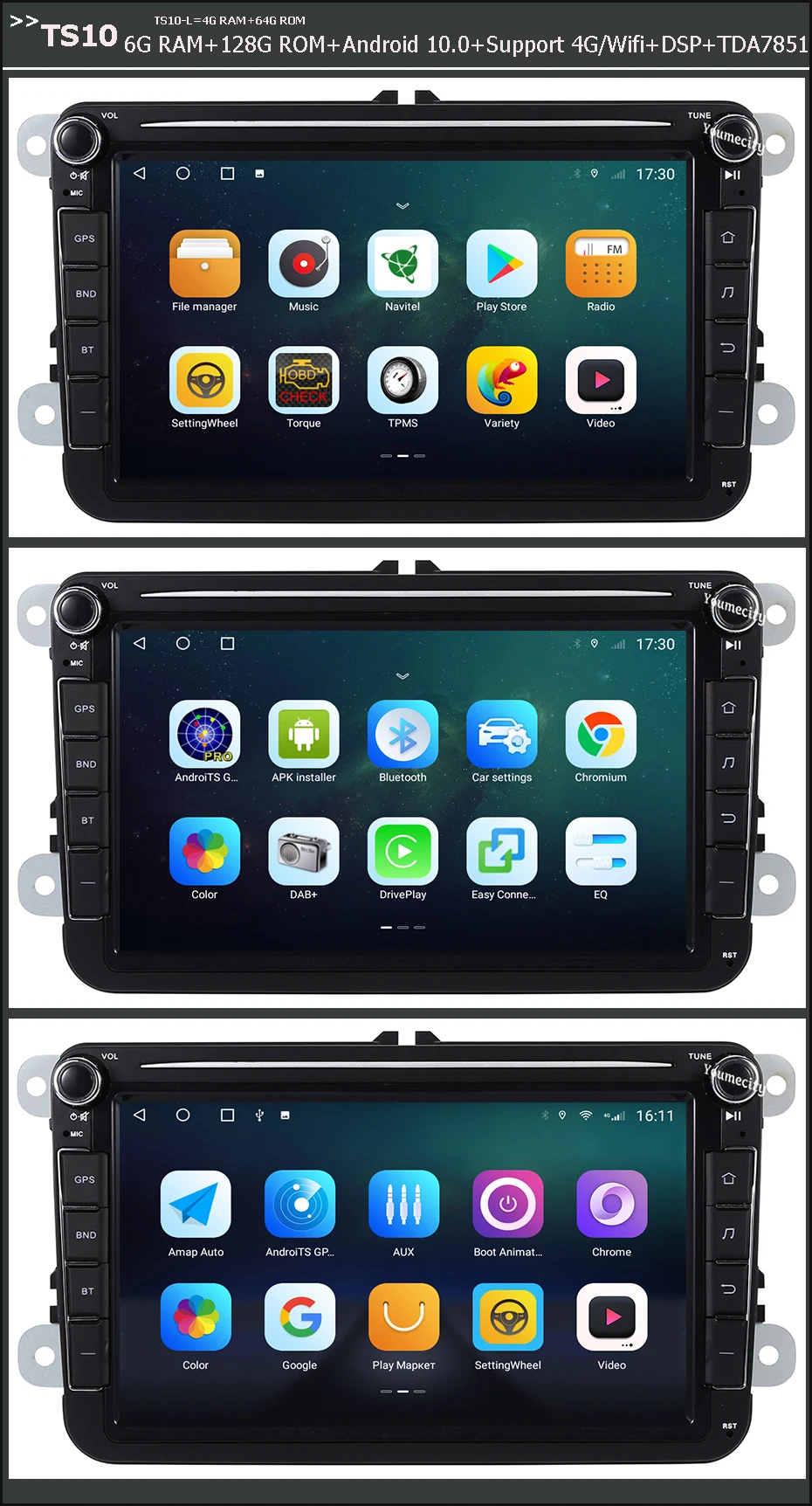 > TS10(Wifi с 4G)= 8 ядер <4 ядра + 4 ядра> + Android 10,0 + 6G RAM + 128G ROM + DSP + поддержка установки 4G sim-карты + Wifi + AHD камера заднего вида подарок + встроенный carplay + Встроенный Android Auto/
