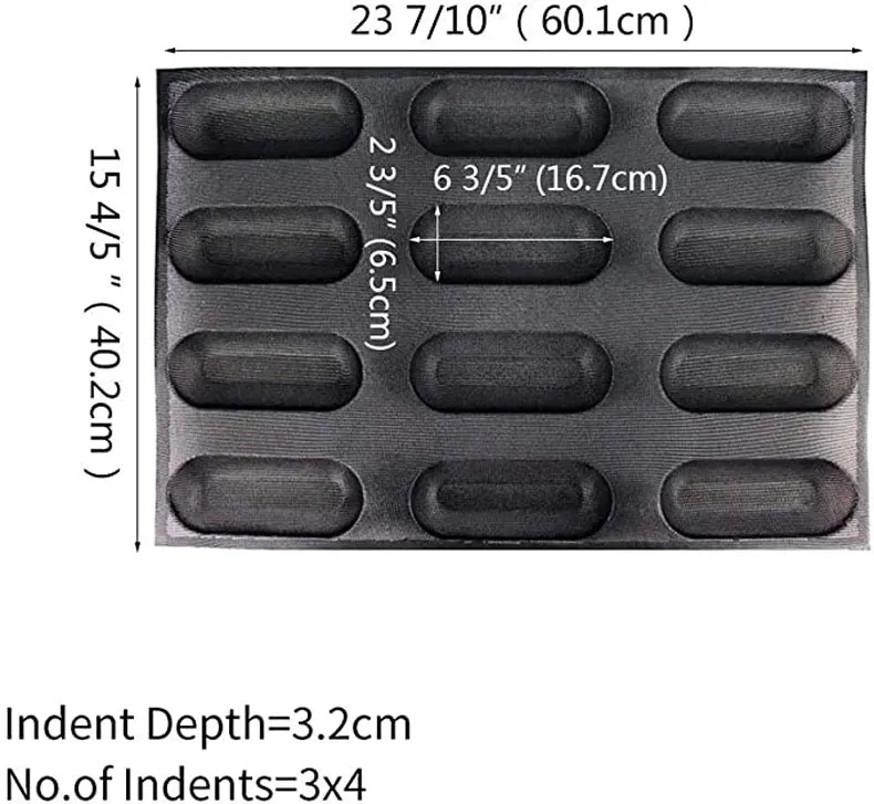 Спецификация: Материал: силикон и стекловолокно Размер формы: 23 7/10 ''x 15 4/5'' (60,1x40,2 см) Размер вмятин: 6 3/5 ''x 2 3/5'' (16,7x6,5 см) Глубина: 1 1/5 ''(3,2 см) Количество вмятин = 3x4 Вес: 6,17 унций/175 г (+/- 5g) Особенности продукта: 1). Пищевой силикон, FDA и LFGB утвержден, 100% BPA бесплатно 2). Высокая термостойкость, -40 ℉ до 500 ℉ 3). 100% антипригарная, легко моется, и эта силиконовая форма для хлеба вымоется безопасно 4). Многоразовые, эта форма для хлеба используется для 3000 раз, Экономьте деньги! Советы: 1). Очистите перед использованием, лучше использовать кипяченую воду 2). Силиконовая форма для хлеба гибкая, лучше использовать вместе с кастрюлей