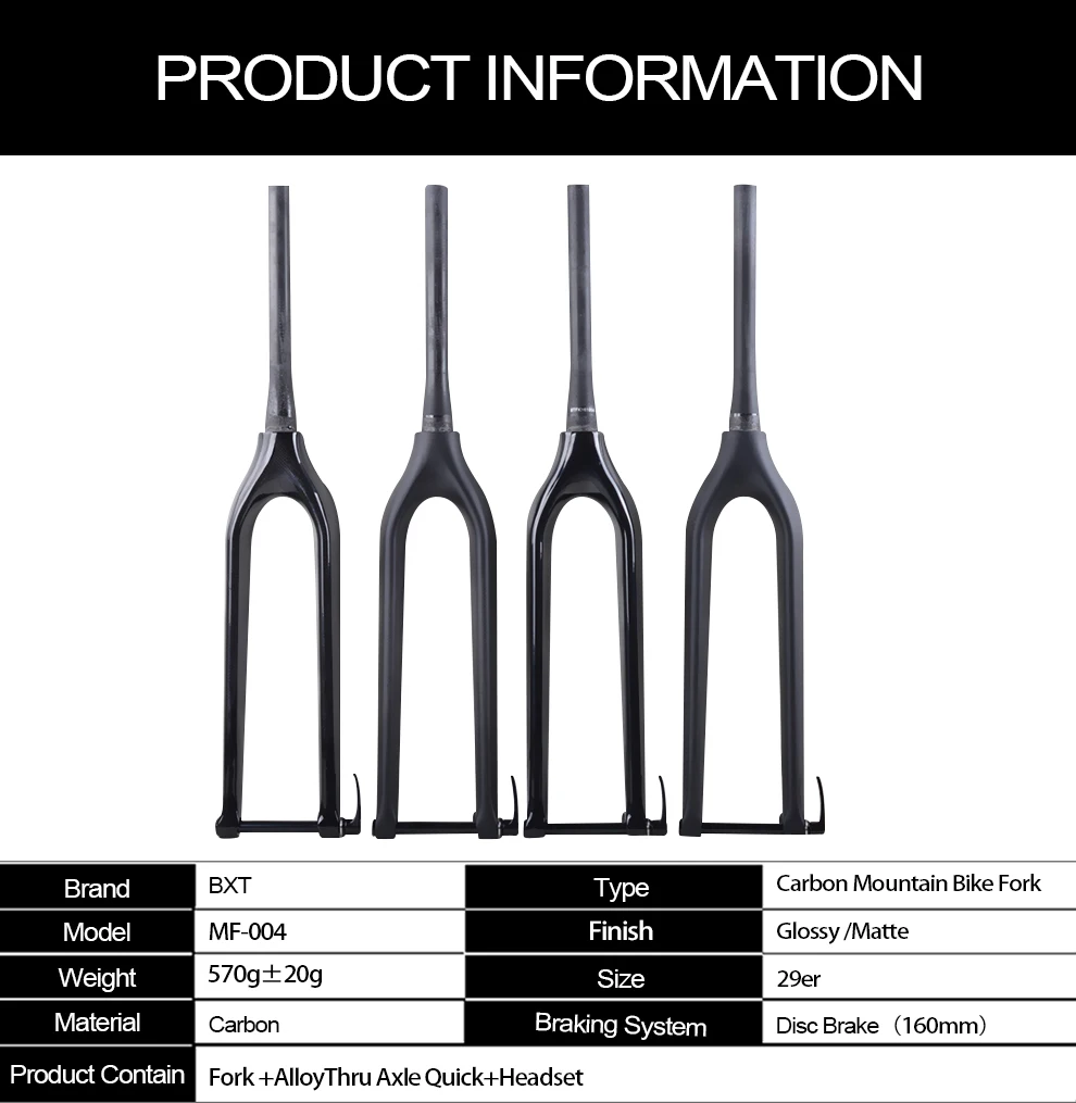 Название: полностью углеродная вилка MTB 29er Модель: BXT-MF-004 Бренд: BXT Материал: углеродный руль Выпадение: 15 мм QR Ткань: 3K/UD Отделка: глянцевая/матовая Конический: 1-1/8 "to1-1/2" Размеры: 29er Внутренний слой: 28,6 мм Подходящий диск: 160 мм