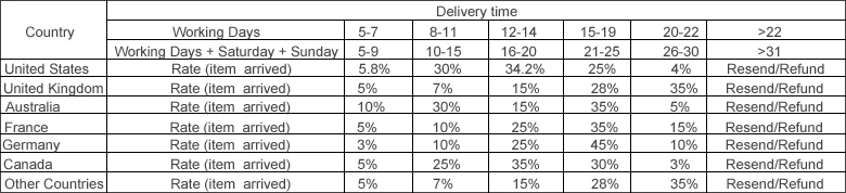 Мы приложим максимальные усилия для того, чтобы предоставить вам наиболее надежные и доступные способы доставки товаров. Но иногда, международная доставка сильно зависит от местная таможенная и почтовая служба. Если вы не можете получить свой заказ в соответствии с расписанием, пожалуйста, свяжитесь с нами, мы предложим вам услугу повторной продажи или возврата, пожалуйста, не сердитесь.