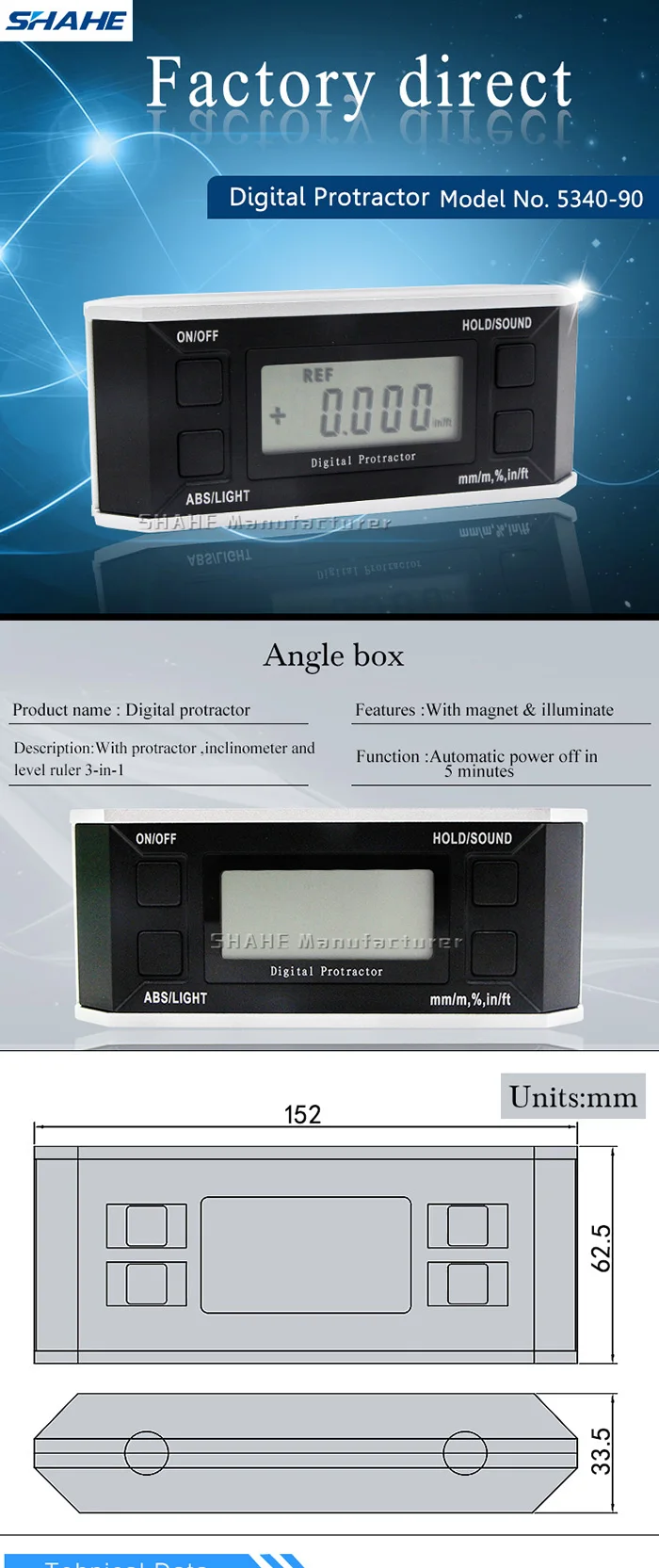 Магнит доступен: Да Доступно освещение: Да Диапазон измерения: 4*90 ° Разрешение: 0,05 ° Точность: ± 0,2 ° Повторяемость: 0,1 ° Батарея: AAA * 2 батареи (не входят в комплект) Рабочая температура: 0 °C-40 °