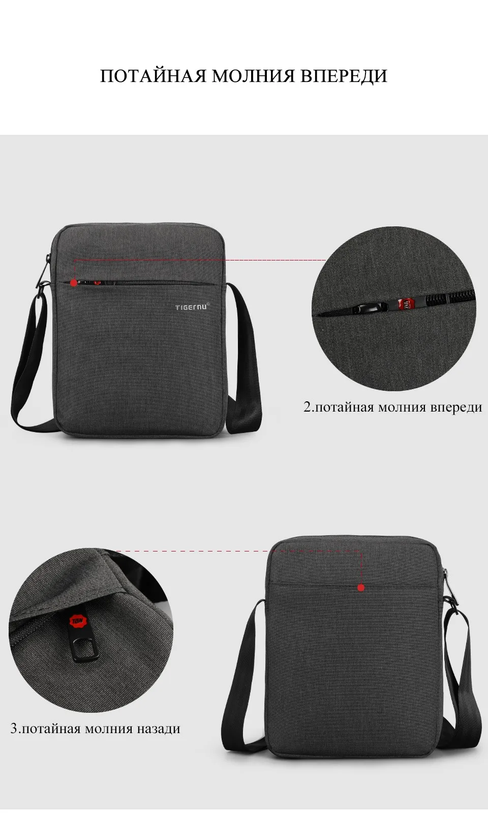 1. Скрытая передняя и задняя молния 2. Водостойкий материал 3. Противоударная панель для Ipad карман 4. Регулируемый плечевой ремень 5. устойчивый к царапинам материал