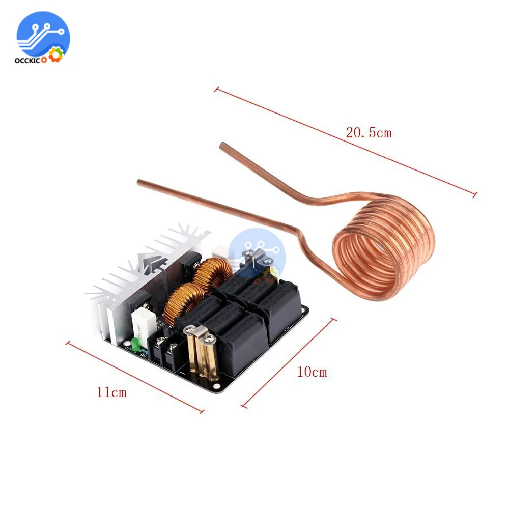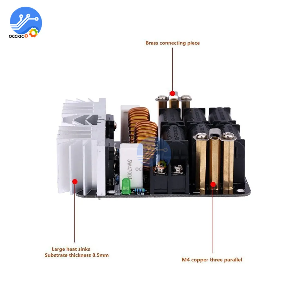 Этот раздел индукционного нагрева с использованием низкого напряжения постоянного тока питания 12-48 в Максимальный ток 20А, максимальная мощность 1000 Вт. Протестированный источник питания 53 в при исправной работе. Из-за своей умеренной мощности, используется для небольших частей DIY игроков закалки, отжига и другой термической обработки, Также может использоваться с графитовым тигель плавления золота, серебра, меди, алюминия и других металлов, Равномерное нагревание быстро, очень удобно. 24V входное напряжение без нагрузки ток 3A 48V вход без нагрузки ток 6A Чем выше напряжение, тем выше ток нагрева, тем лучше эффект, Но в то же время тепло также велико, поэтому для устранения реальной ситуации, чтобы выбрать входное напряжение, Общее использование слов 24V 36V источника питания достаточно. [Примечание] 1. В комплект входит полный набор элементов цепи вождения и латунь 2. Покупателям необходимо принести свою собственную мощность и блок охлаждения. 3. Печатная плата с использованием двусторонней стекловолокна, в основном, медные следы используются для расширения Используйте общую обратную поверхность резонансной цепи, Непрерывная работа, пожалуйста, добавьте вентилятор, чтобы сдуть сверху, К резонансным конденсаторам и другим компонентам прохладно. 4. Использование импульсного источника питания обратите внимание, что из-за высокой мощности, как правило, медленная функция запуска, Которое только что открыло устройство, выходное напряжение медленно растет, в то время как оно включено до индукционного нагрева, если напряжение поднимается до 12 В, потому что пуск недостаточного напряжения не может позволить себе вибрацию, В результате двух одновременных проводящих mos труб, поэтому сгорели компоненты. Таким образом, первый начнет переключать напряжение источника питания достигает 12 в выше, а затем получить доступ к индукционной нагревательной цепи. 5, объем нагреваемого объекта внутри нагревательной катушки не может превышать 1/5 от объема (Если нагревательный цилиндр, то диаметр нагревательной катушки меньше диаметра 1/3), Или это может быть из-за перегрузки или выгорания источника питания на цепь. Хотя эта схема может переносить 20-30A входной ток, но не превышать 15A при безопасной работе, Вы можете легко добавить Амперметр между источником питания и нагревательным Драйвером Плата, но всегда отслеживает перегрузку тока. Эта схема может не только сделать индукционный нагрев, медная трубка в высокочастотный трансформатор, является мощным инвертором 1, для того, чтобы увеличить теплоотвод с помощью по индивидуальному заказу подложка толщиной 8,5 мм! Мощность охлаждения очень мощная. 2, используя столбы M4, лихорадка меньше, эффективнее. Посылка включает в себя: 1 x нагревательная доска 1 x латунь