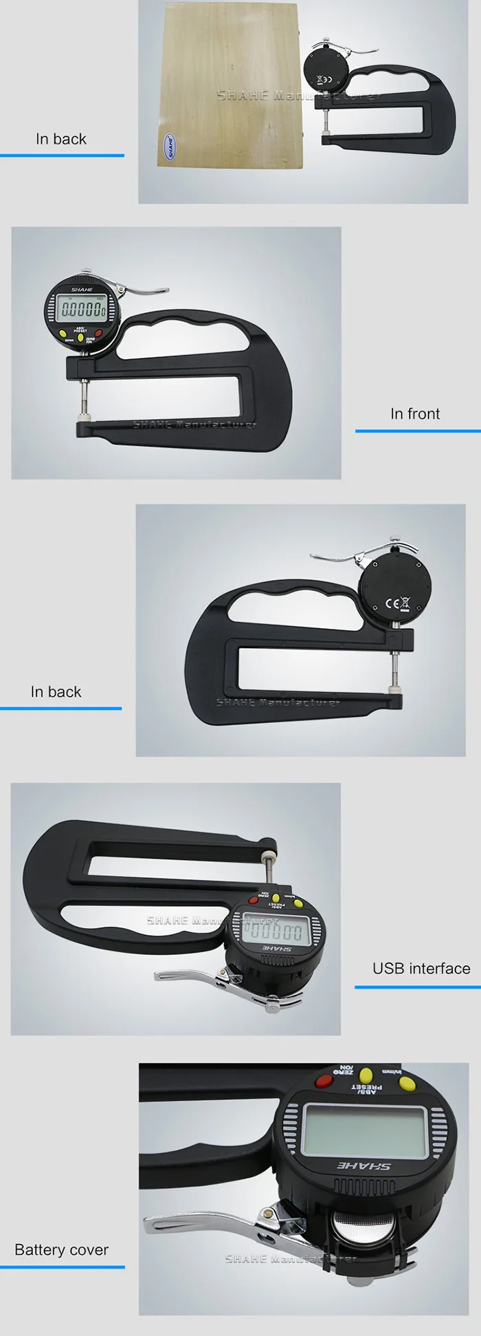1. Керамическая измерительная головка, металлический корпус и ручка, компактная и прочная структура, удобная и стабильная работа 2. Быстрый дисплей измеренного значения на большом ЖК-экране 3. С выключателем питания и автоматическим выключением для опции 4. Нулевая Настройка в любом положении 5. Конвертация измерительной системы мм/дюйма 6,3 V CR2032 окружающей среды литиевая батарея 7. Три различных типа измерительной головки 8. Измерение толщины ювелирных изделий, кожи, металлической пленки, бумаги, резины, ткани и различных металлических панелей, стеклянных листов и т. д.