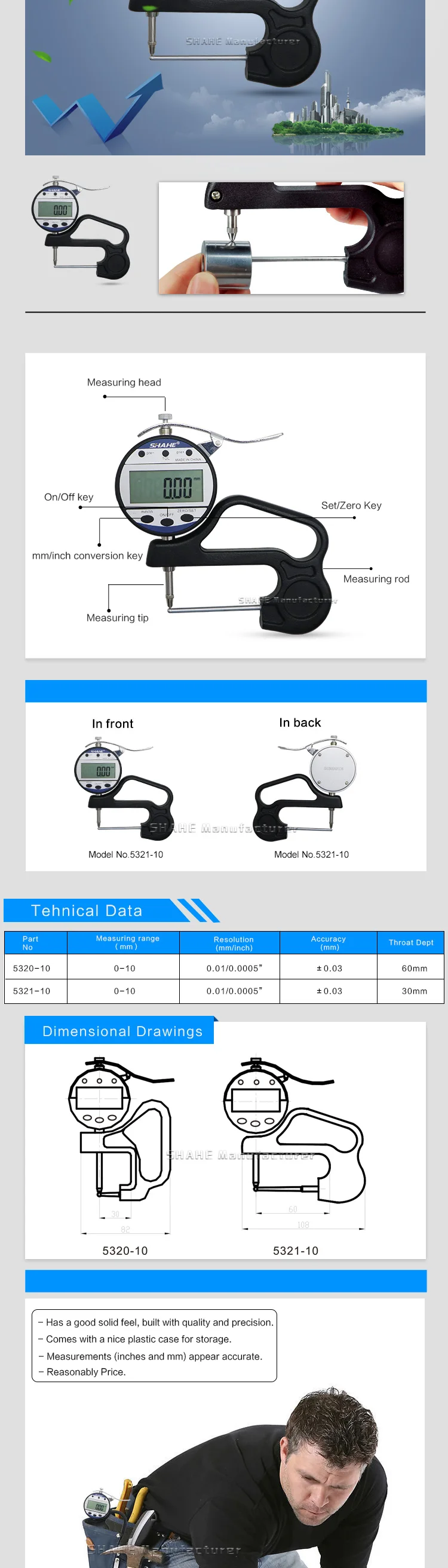 Диапазон измерения: 0-10 мм/0-0,4 дюйма Разрешение: 0,01 мм/0,0005 дюймов Точность: 0,03 мм/0,0012 дюйма Горло: 60 мм Батарея: 3V enviromental литий Батарея (CR2032)