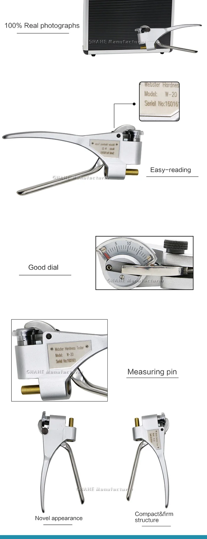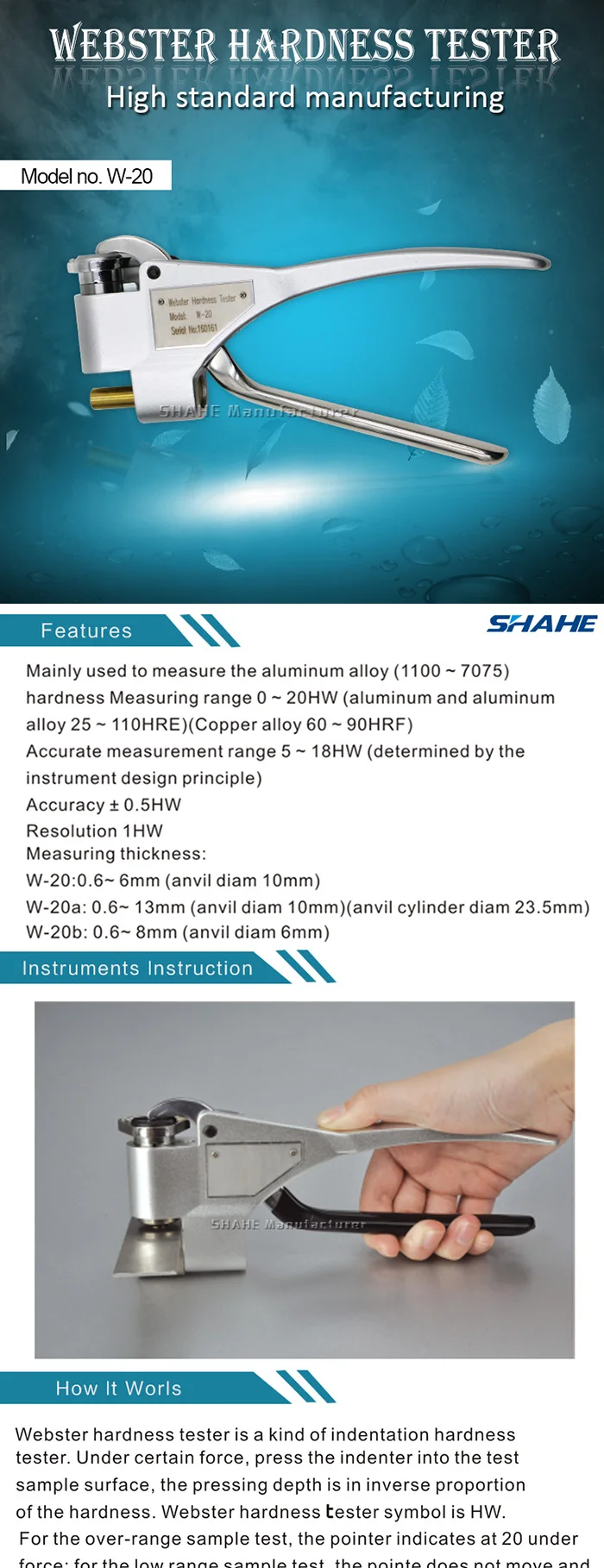 Измеритель Твердости Webster-это портативный инструмент, который может удобно измерять алюминий, особенно может измерять специальные формы заготовки, которые не могут быть или неудобны для измерения другими инструментами, такими как экструзии, трубы, пластины и так далее. Процесс тестирования не повреждает заготовку, и нет необходимости в получении образца, он специально применяется на производственной площадке, на площадке продаж или на строительной площадке.