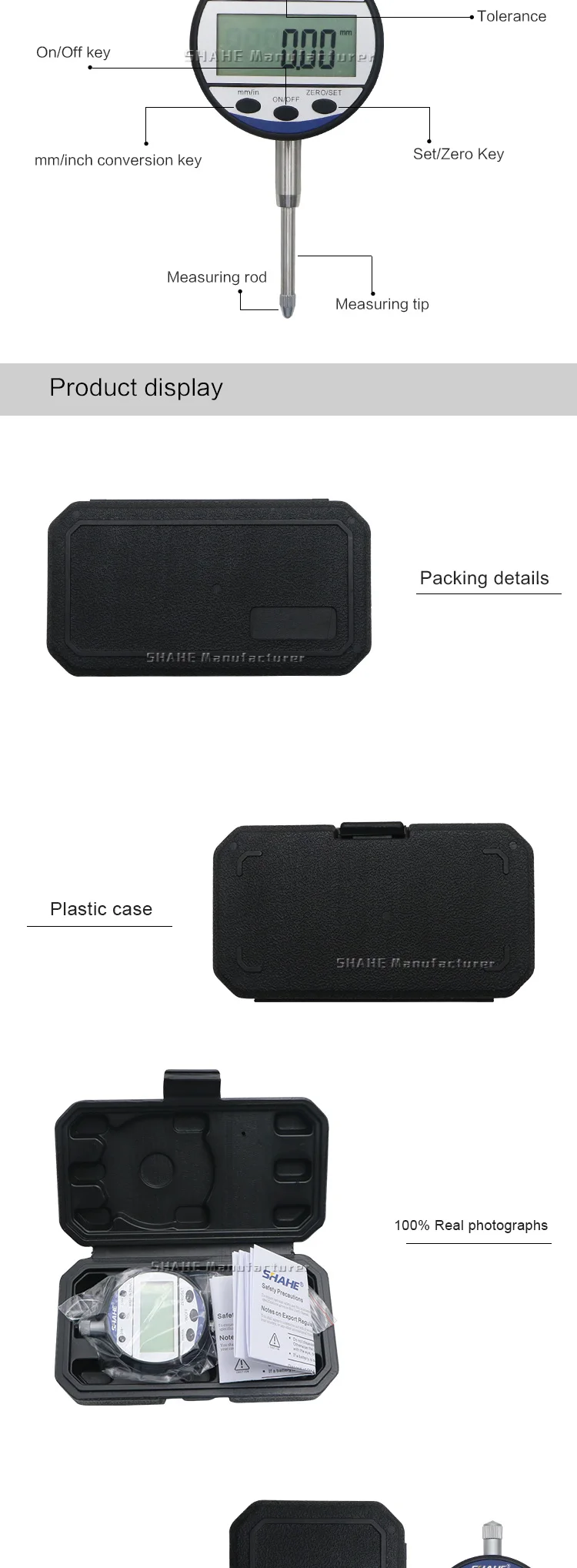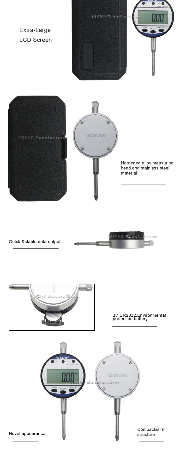 Примечание: посылка будет отправлена без аккумулятора, тип батареи-3 в CR2032 экологический литиевый аккумулятор ★Особенности 1. Измерительная головка из закаленного сплава и материал из нержавеющей стали 2. Компактная и прочная конструкция, удобная и стабильная работа . Быстрый дисплей измеренного значения на большом ЖК-экране 4. С кнопкой включения-выключения, автоматическое выключение 5. Шесть функциональных кнопок 6. Нулевая Настройка в любом положении 7. Конвертация измерительной системы мм/дюйма 8,3 В экологическая литиевая батарея, срок службы батареи> 1 год 9. Измерения для формы и допуска положения, такие как бегунок, прямолинейность, параллелизм, плоскость и т. д. ★Параметры Диапазон измерения: 0-25,4 мм Разрешение: 0,01 мм Точность: ± 0,03 мм