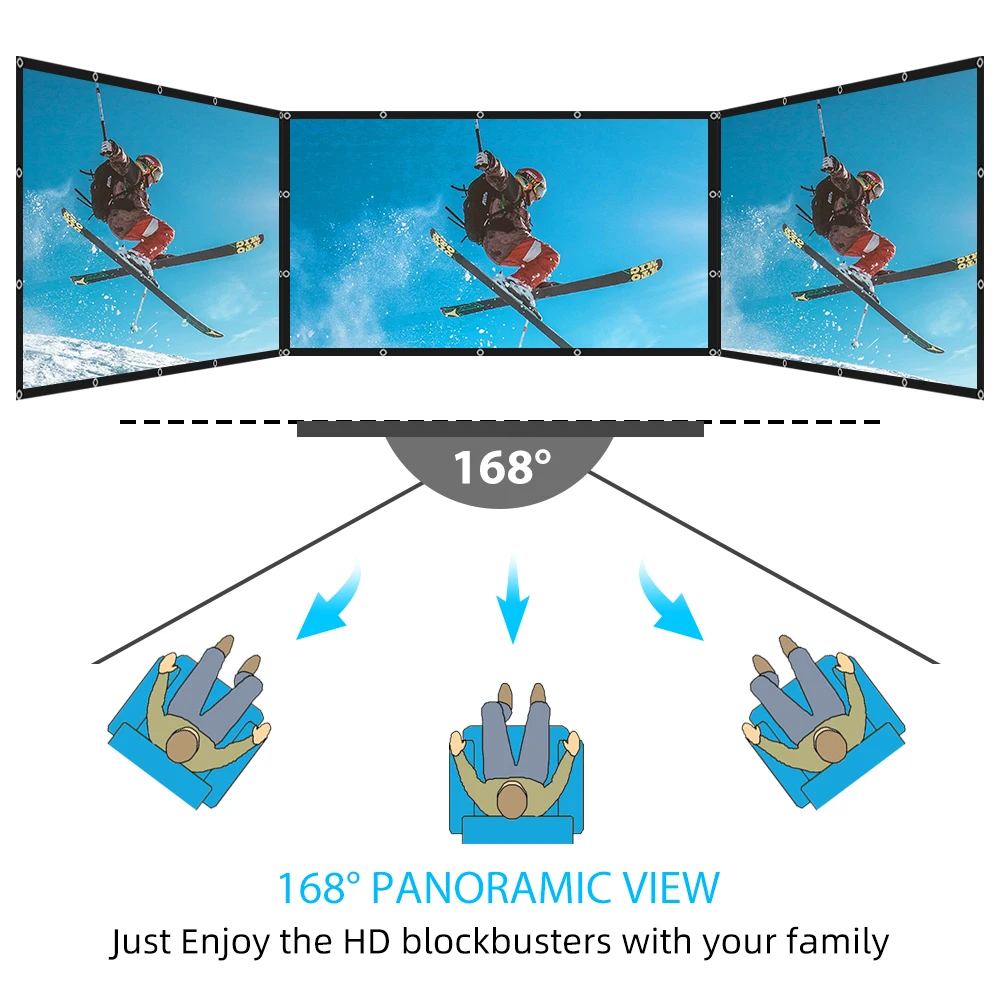 -Экран 16:9 HD 4K, соотношение 16:9, широкий угол обзора 168-175 °, экран фильма предназначен для обеспечения резких и высокого разрешения изображений, обогащенных цветов, И превосходное качество просмотра в разных положениях.