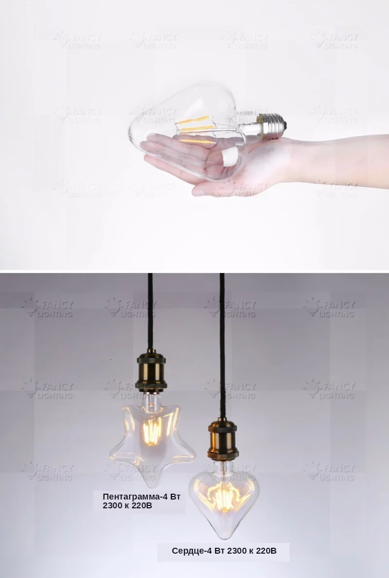Модель: пятиконечная звезда/Сердце светодиодный лампы Размеры: Пентаграмма: 140*175 мм (5,5*6,9 дюйма) Сердце: 110*150 мм (4,33*5,9 дюйма) Мощность: 4 Вт Напряжение: 220V Держатель лампы: E27 Цветовая температура: теплый белый 2300K Уважаемые покупатели, по этой ссылке производится только продажа ламп. В комплектацию не входит подвесная лампочка/настольная лампа, указанные на фото.