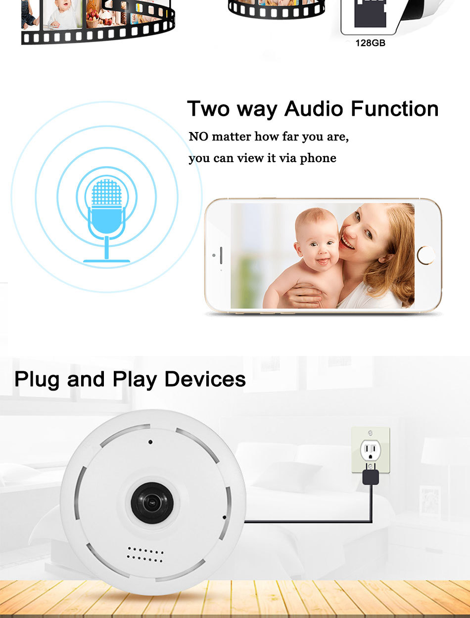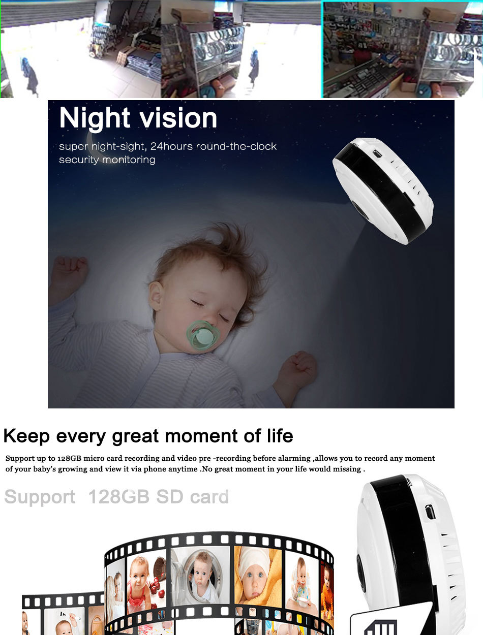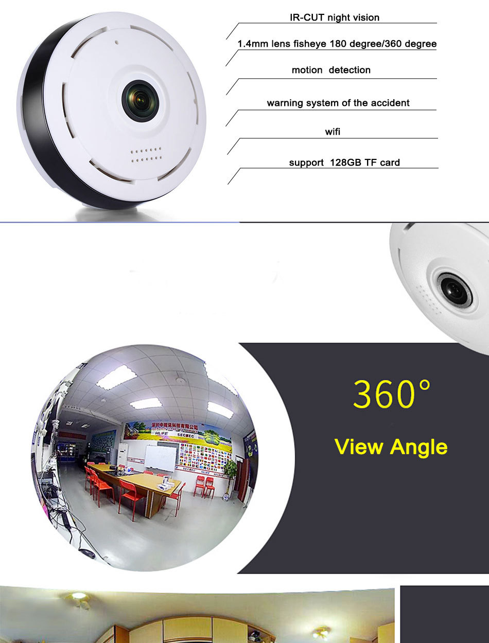 Супер широкий угол обзора: 360 градусов панорамный угол обзора с 1/3 ''линзой рыбий глаз, без слепых зон, увидеть всю комнату в потрясающем HD качестве видео в течение дня или ночью (с ночным видением) Супер широкий угол обзора: 360 градусов рыбий глаз Wi-Fi ip-камера без слепых пятен. Камера следит за каждым углом в вашем доме/магазине/офисе, никогда не пропустите ничего, что произошло в области мониторинга. Одного достаточно для вашей домашней безопасности. Обнаружение движения:Получайте информацию о каждом движении в вашем доме с помощью push-уведомления по телефонуИли храните предупреждающие изображения на микро-sd; Датчики обнаружения движения «чувствуют» его, когда что-то движется в комнате и сообщат вам немедленно; Идеально подходит для наблюдения. Прост в использовании:Подробная инструкция, Простота подключения, простота в использовании, быстрая настройка Wi-FiЧерез iOS или Android смартфон с помощью прилагаемого приложения; Удаленный доступ к камере на смартфоне через мобильную сеть 4G или WiFi. Для домашнего использования, мониторинга домашних животных, мониторинга бизнеса, записи детей, ухода за пожилыми людьми и т. д.