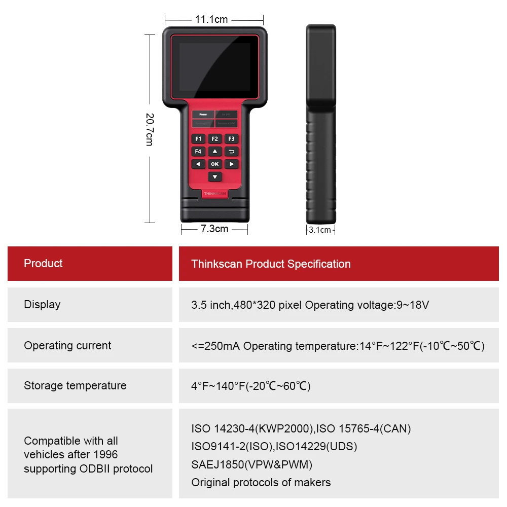 Thinkscan TS609 Параметры: Дисплей: 3,5 "ЖК-дисплей с хороший визуальный эффект Рабочая температура: от 0 до 60 (от 32 до 140) Температура хранения: от-20 до 70 (от-4 до 158) Мощность: от 8 до 18 в обеспечивается через транспортное средство Поддерживаемые протоколы: J1859-41.6, J1850-10.4, ISO9141, KWP2000 (ISO 14230) и CAN (сеть управления областью ISO 11898 Вес: 0,8 кг