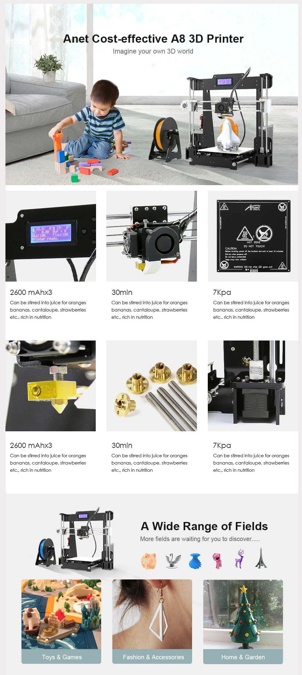 Модель: A8 Цвет: черный Структура: акриловая структура Количество экструдера: 1 Размер печати: 220*220*240 мм Разрешение печати: ± 0,1 мм Толщина слоя: 0,1-0,3 мм Онлайн/офлайн печать: оба ЖК-дисплей: 2004LCD Скорость движения: 10 ~ 300 мм/сек. Скорость печати: 40-120 мм/сек. Стандартный диаметр сопла: 0,4 мм Рабочая температура экструдера (макс.): 250 ℃ Температура горячей кровати (макс.): 100 ℃ Материал горячей кровати: алюминиевая печатная плата Ось XY Presicion: 0,012 мм Z-осевое позиционное давление: 0,004 мм Нити для печати: PLA Диаметр нити (мм): 1,75 Рекомендуемая нить: PLA Язык программного обеспечения управления: английский (версия цветного экрана поддерживает китайский и английский языки) Формат ввода данных: STL, OBJ, JPG Формат вывода данных: Gco, Gcode Формовочный порт автоматически: Да Размер машины: 380*420*450 мм Вес нетто: 6,5 ± 0,1 кг Размер упаковки: 325*250*500 мм Посылка Вес: 7,5 ± 0,1 кг Источник питания/Максимальная мощность: 110 В/220 В переменного тока 250 Вт Операционная система: Windows,MAC Программное обеспечение для печати: Cura Рабочее состояние: температура: 0-40 ℃, влажность: 5-80%