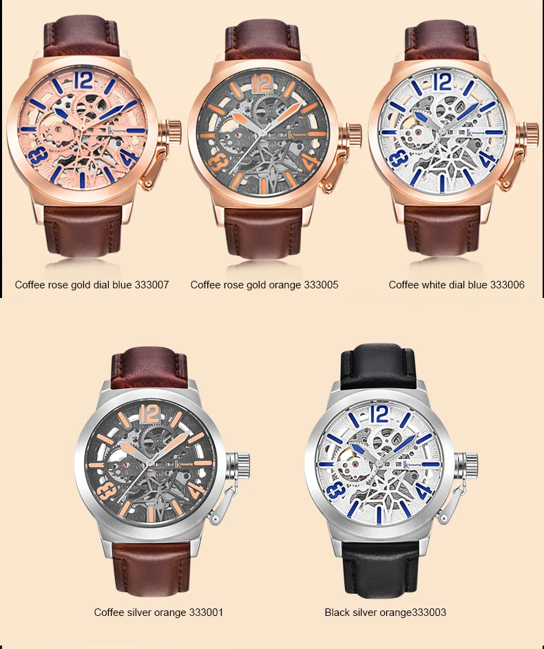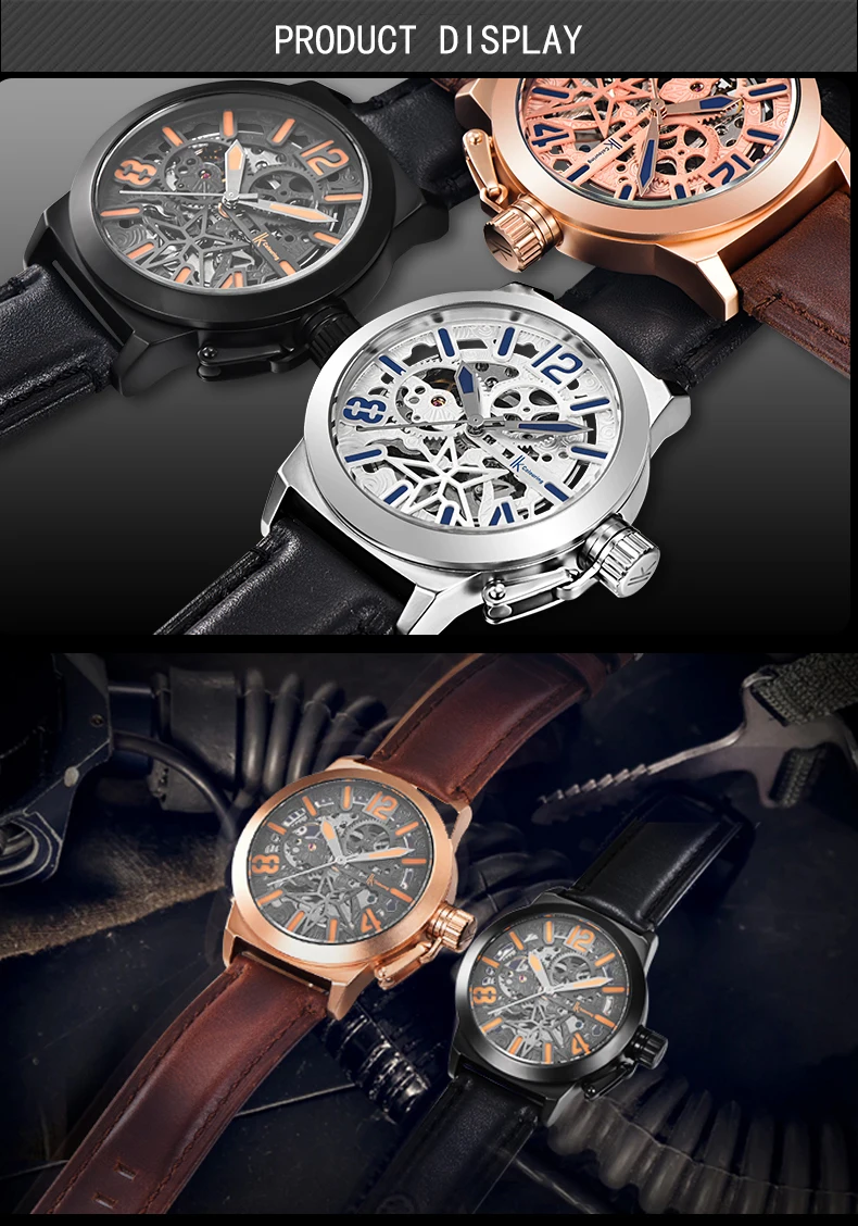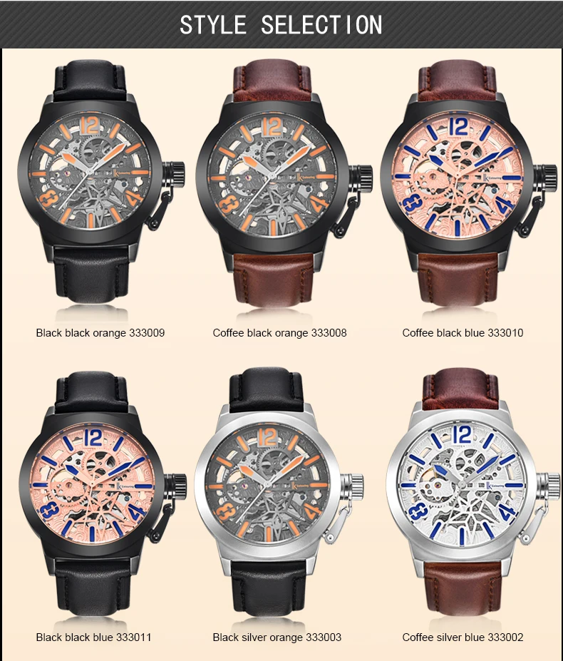 Характеристики: ремешок из натуральной кожи, чехол из сплава, водонепроницаемость 30 м, Hardlex, масштаб с арабскими цифрами, импортное автоматическое механическое движение, прозрачный полый задний комбинезон.