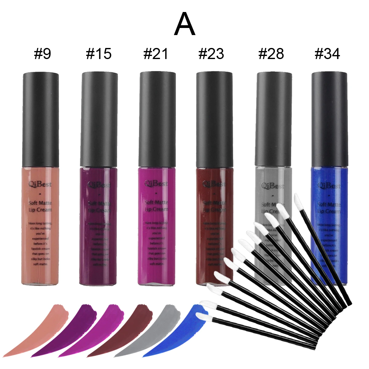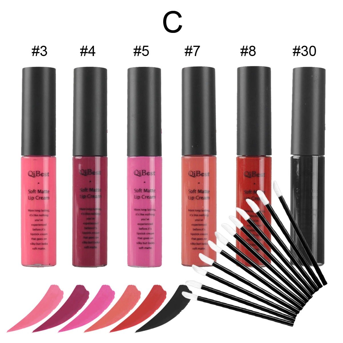 Описание: Qibest блеск для губ Этот крем для губ образуется как трубчатый смоченный кистью, сделан с матовым эффектом, но не таким сухим, как обычная матовая помада, возможно, из-за своей особой текстуры нельзя сделать коагулированную пасту. 6 групп на выбор (A B C D E F) Упаковка включает в себя: 6 видов цветов Блеск для губ 12 кисть для губ