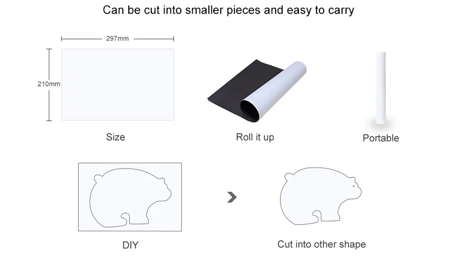 Название: Магнитная мягкая белая доска Материал: ферритовый магнитный порошок, ПЭТ-пленка Особенности: самомагнитная, гибкая, сухая салфетка Размеры: А4 Толщина: 0,3 мм Стираемость: высушите после 30 дней