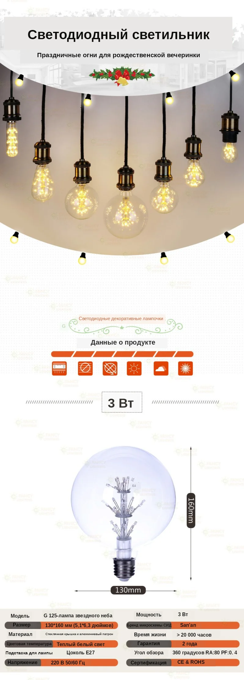 Модель: G125 -- лампа звездного неба Размер: G125: 130*160 мм (5,1*6,3 дюйма) Мощность: 3 Вт Держатель лампы: E27 Напряжение: 220 В переменного тока Цветовая температура: теплый белый 2300K Уважаемые покупатели, по этой ссылке производится только продажа ламп. В комплектацию не входит подвесная лампочка/настольная лампа, указанные на фото.