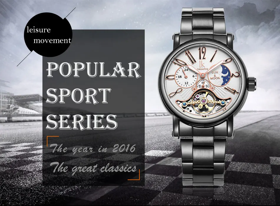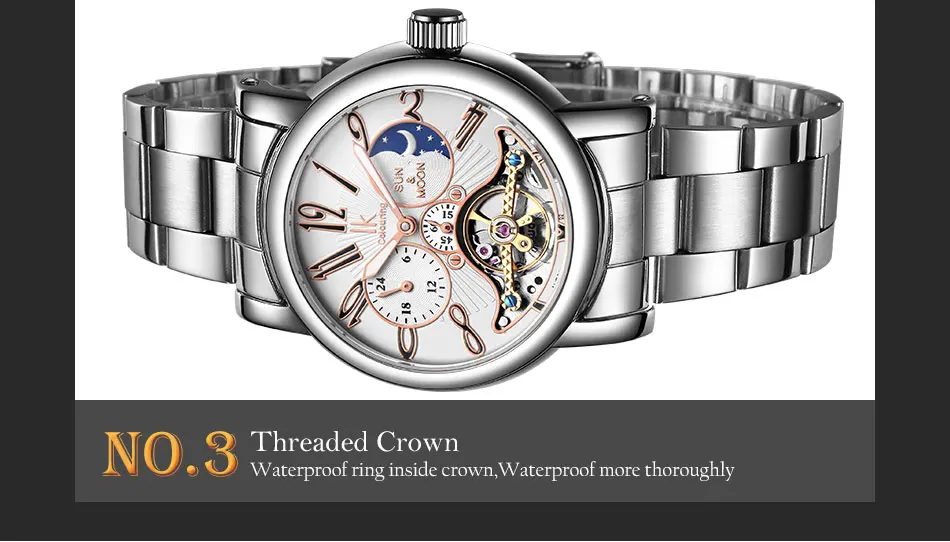 Особенности:Ремешок из нержавеющей стали, импортное автоматическое механическое движение, циферблаты «Луна» и «Звезды», циферблат «24 часа и секунды», персонализированный циферблат с арабскими цифрами, светящиеся стрелки, спортивные механические часы.