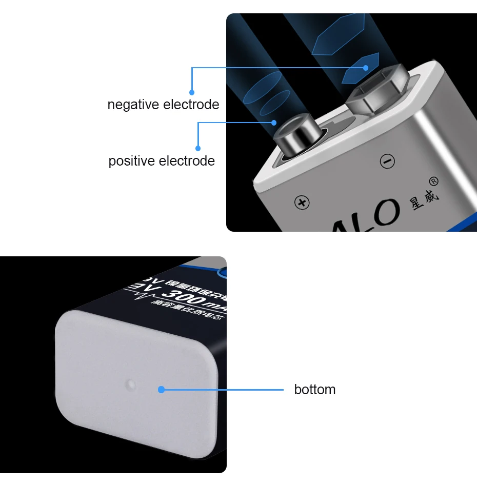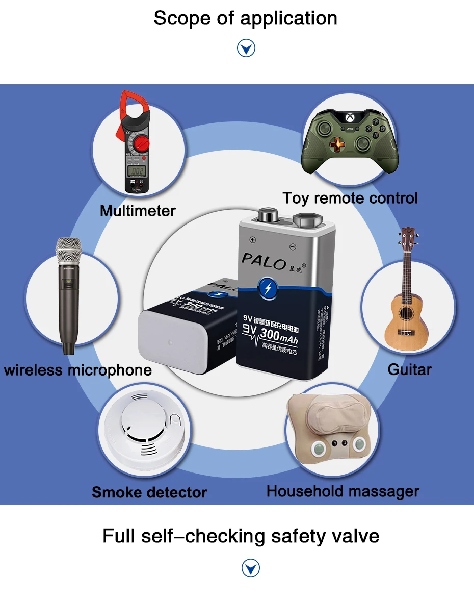Для аккумулятора 9 в:Особенности:1. Тип: аккумуляторная батарея2. Емкость: 300 мАч3. Напряжение батареи: 9 В4. Химия: Ni-MH5. Вес: 30 гПреимущества низкого саморазряда батареи:1, высокая скорость удержания заряда.2, сильная сохраняемая способность напряжения батареи.3, низкий уровень потери емкости батареи.4, долгий и стабильный Срок службы батареи.5. Высокая температура разрядки.Внимание:Аккумулятор должен быть полностью заряжен перед первым использованием.Аккумулятор находится в прохладном и сухом месте.Не отделять, не выдавливать и не ударять.Не кладите батарею в воду и огонь.Беречь от детей.