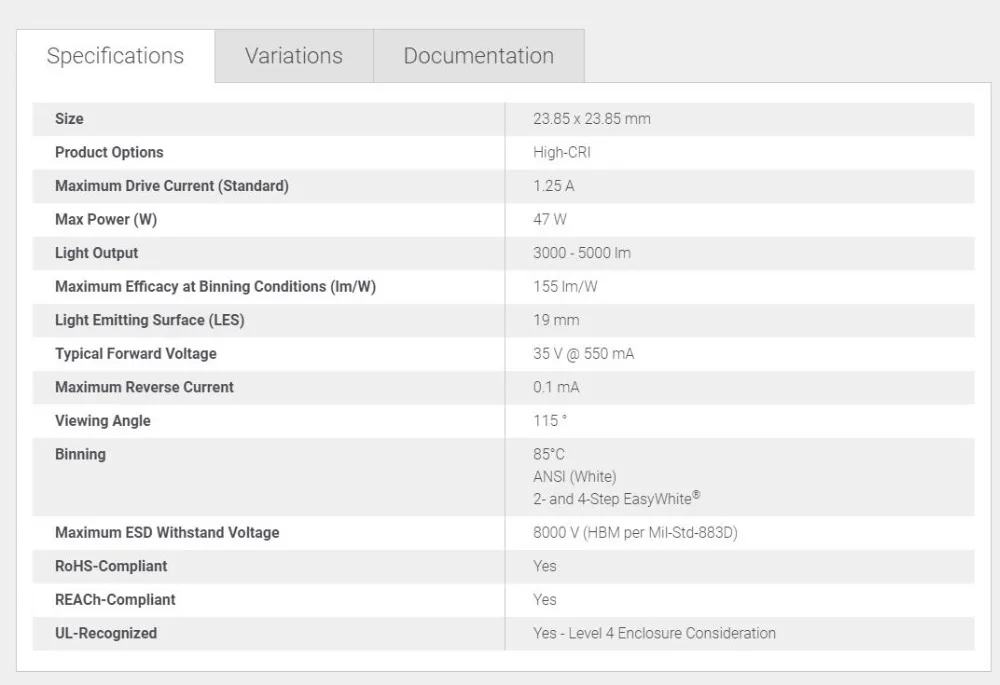 Доступно в белых ящиках ANSI, а также в 4-ступенчатых ящиках easyWhite по адресу 5700 K и 6500 K CCT