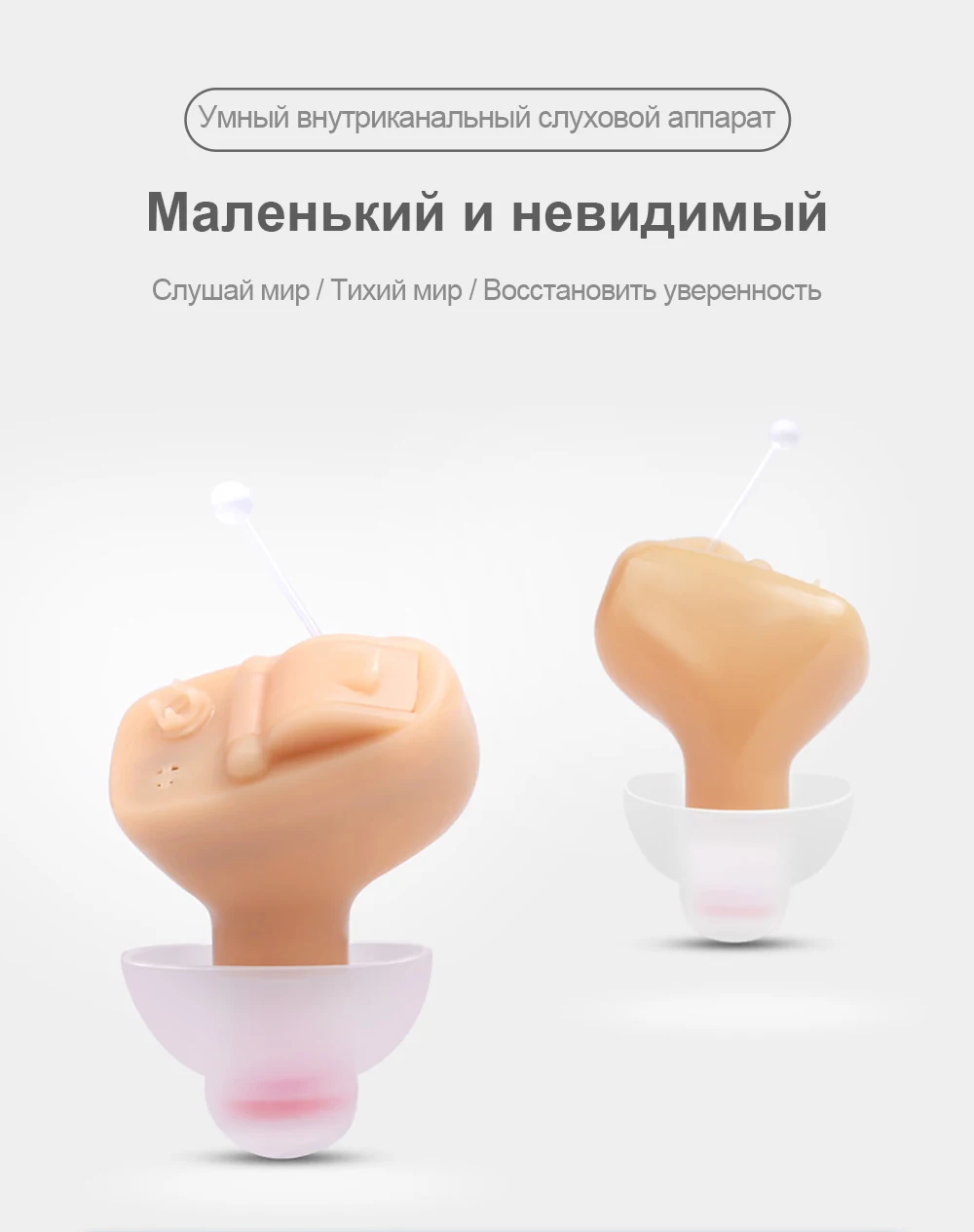 1. Вставьте аккумулятор в отсек для батареек. 2. В зависимости от размера ушному каналу, выберите подходящий наушник, чтобы установить. 3. Уменьшить громкость 4. Вставьте слуховой аппарат в ушному каналу и регулировать громкость на подходящем месте