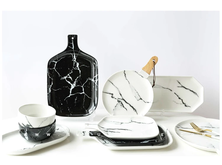 Мраморная текстура в последние годы, горячая, элегантная и щедрая, уникальная для его нанесения на столовую посуду, но и некоторые из своих собственных, похожих на очарование пейзажной живописи черного цвета И белый фон, украшенный изящными и необычными мраморными линиями, такими как полностью натуральная деревянная ручка, западные блюда, миска для риса, различные варианты для удовлетворения различных Потребности