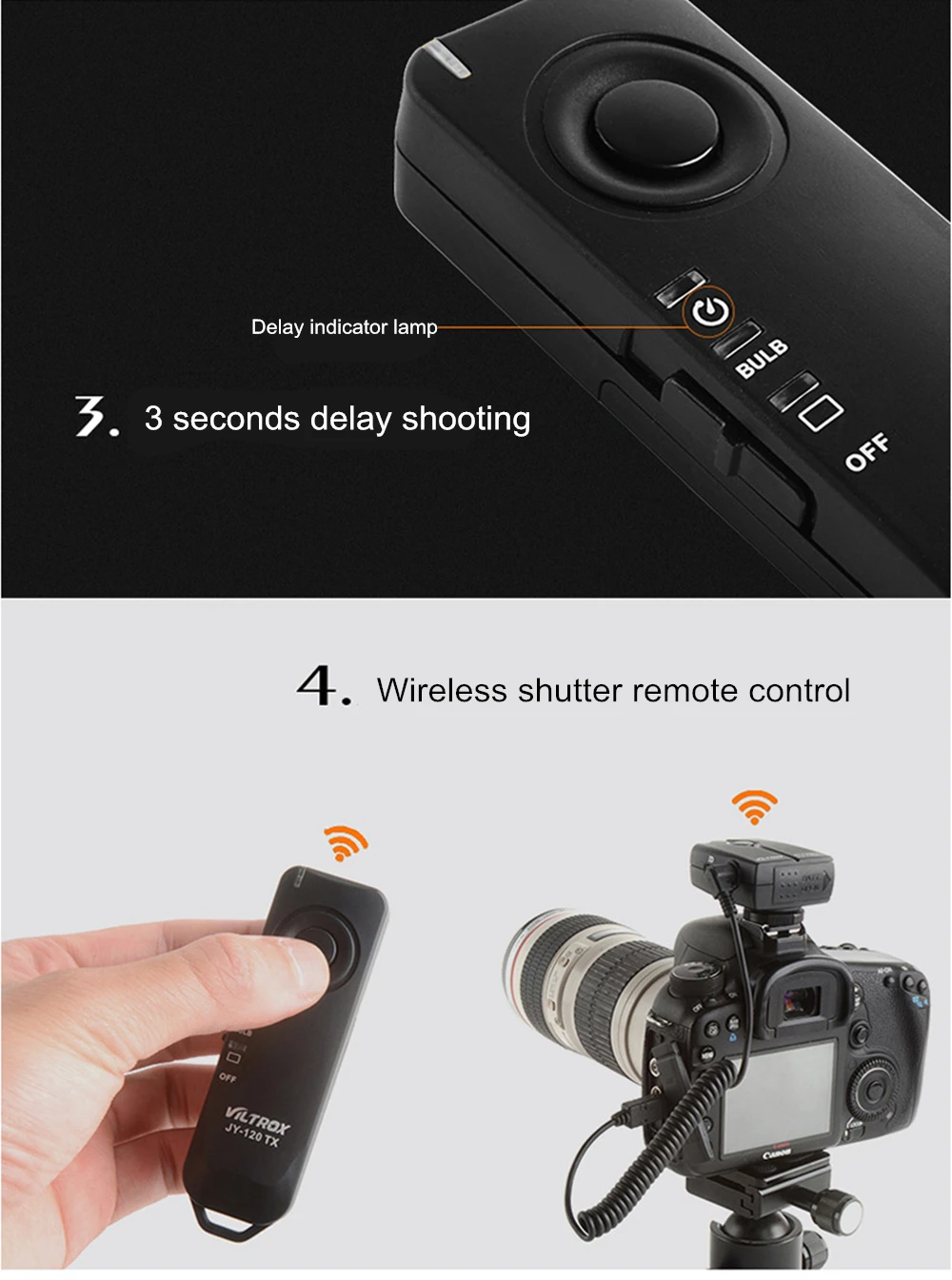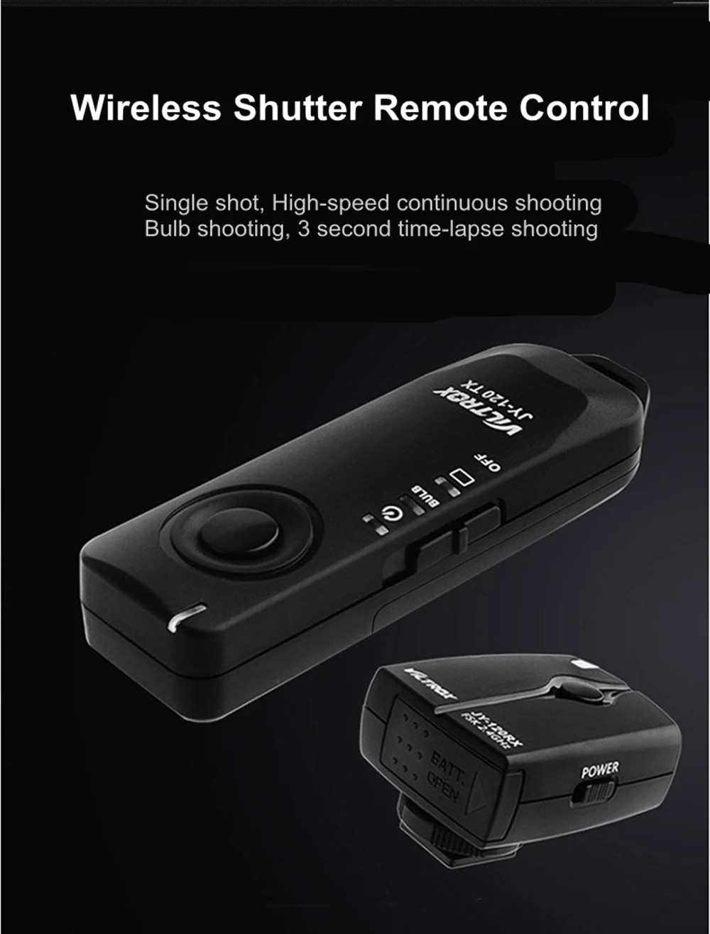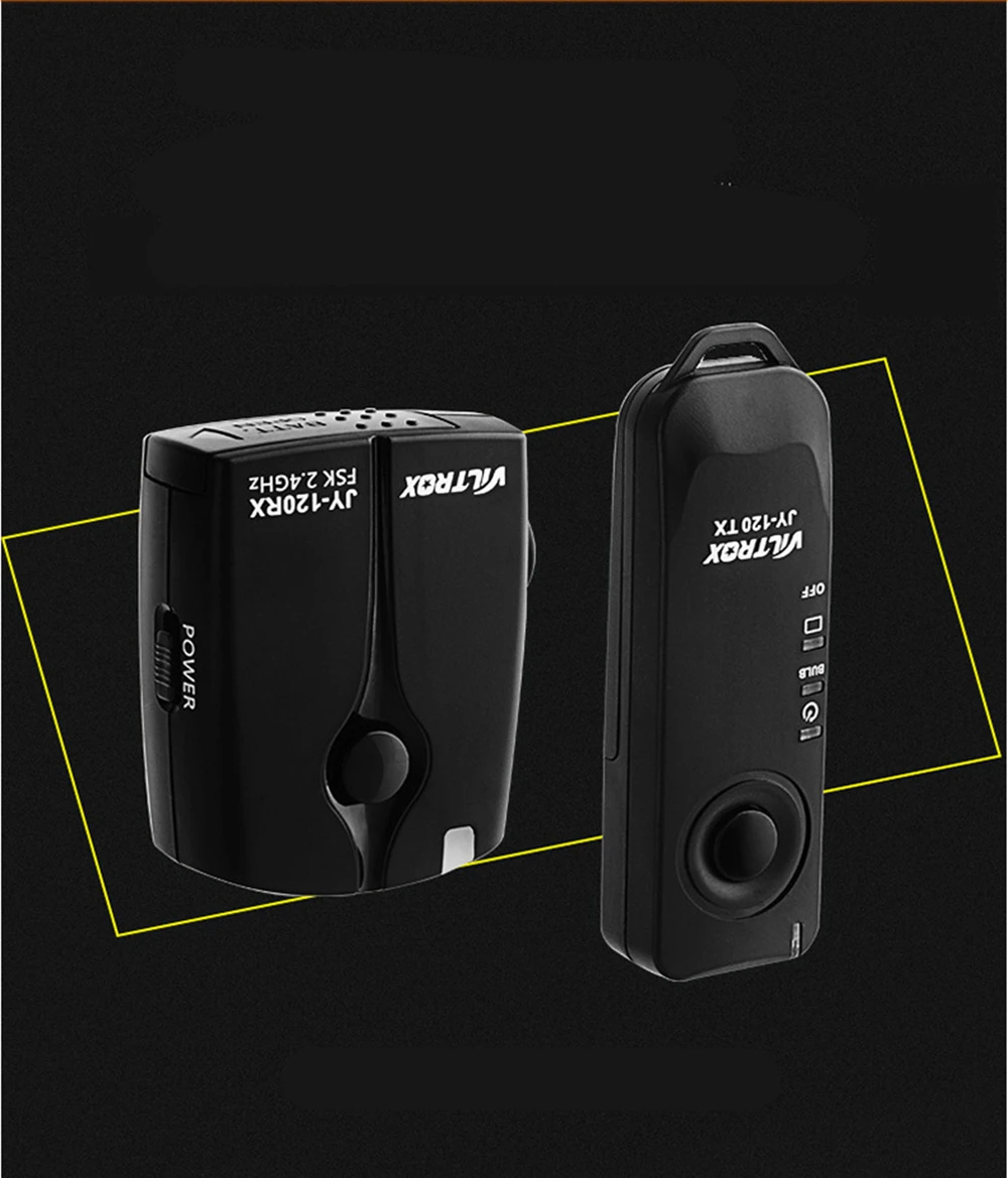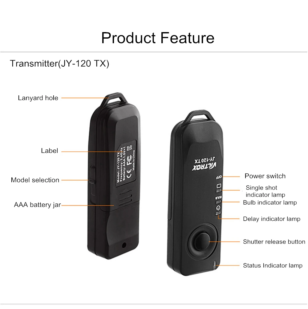 Пульт дистанционного спуска затвора Viltrox JY-120 можно использовать для дистанционного управления камерой с помощью беспроводного управления, чтобы уменьшить дрожание камеры и увеличить резкость изображений. Сильная интерференционная способность, а также истощенная Потребляемая мощность обеспечивают более длительный период использования. Частота 2,4 МГц, и приемник использует элементов питания типа AAA.