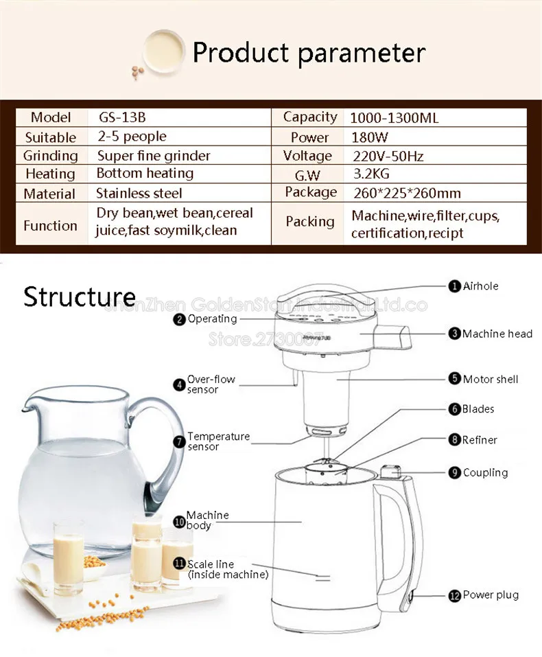 Название: машина для производства соевого молока Joyoung Модель: DJ13B-C85SG Подходит: 2-5 человек Нагрев: нижний нагрев Материал: нержавеющая сталь Емкость: 1000-1300 мл Мощность: 750-1000 Вт Напряжение: 220-50 Гц Вес брутто: 3,2 кг Размер посылка: 260*225*260 мм