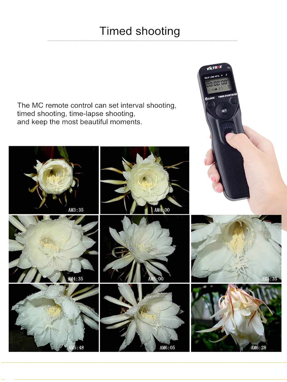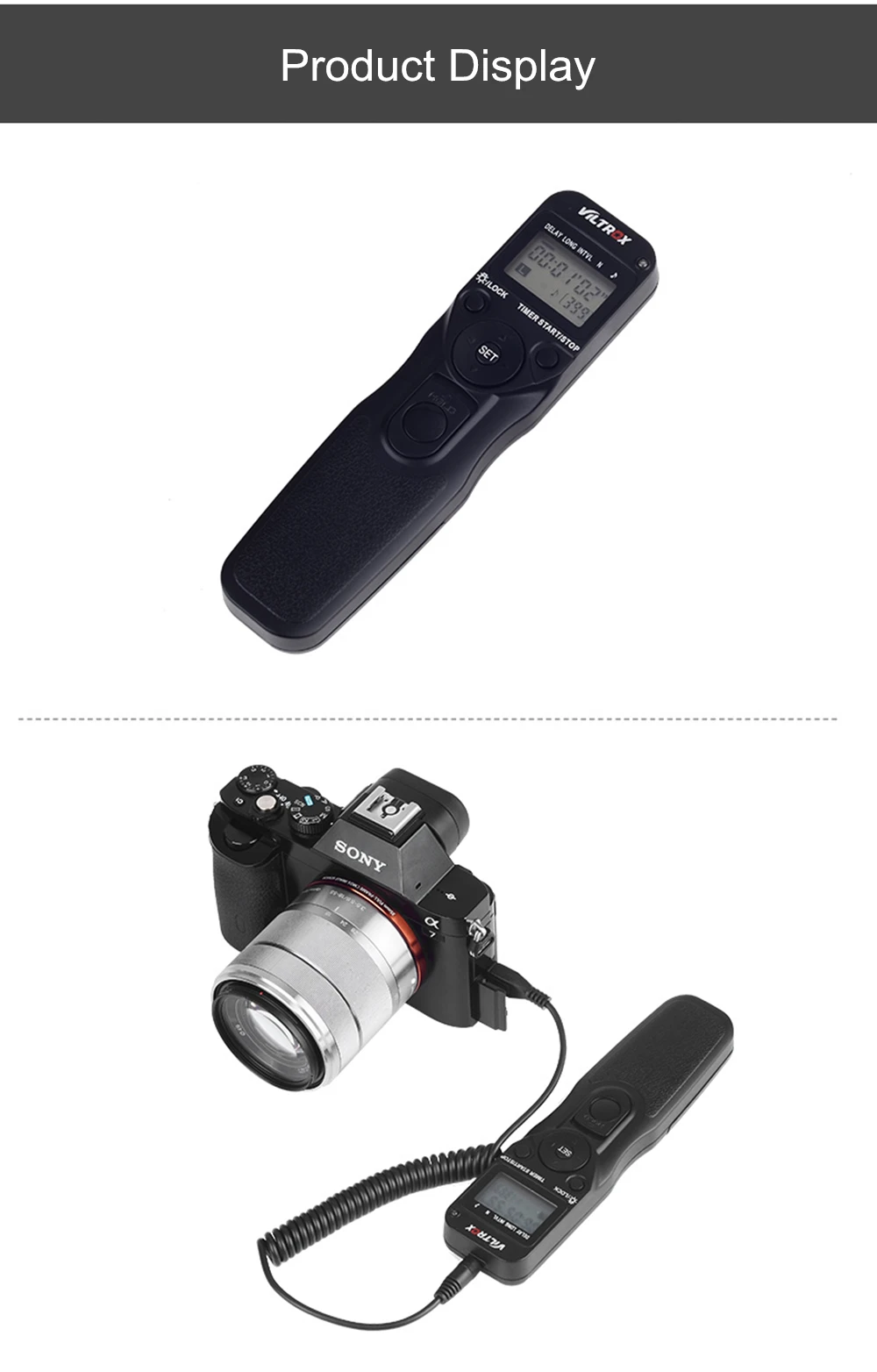 -- Задержка/Автоспуск (задержка) Так же, как и таймер на вашей камере. Пульт дистанционного управления таймером позволяет установить любую задержку (с шагом 1 секунды) до 99 часов, 99 минут и 99 секунд. -- Интервальный таймер (INTVL) Интервальный таймер можно установить в любое время до 100 часов. Если вы установите его до 10 минут, например, одна экспозиция будет занята каждые 10 минут, пока не закончится пленка или не будет достигнут лимит экспозиции. -- Лампа/продолжительная экспозиция (длинная) Это позволяет вам выдерживать воздействие до 100 часов. -- Количество экспозиций (N) Эта настройка позволяет установить время воздействия, которое будет снято, в общей сложности до 399 раз. Например, если вы установите его в 30 раз, то воздействие будет занимать всего 30 раз.