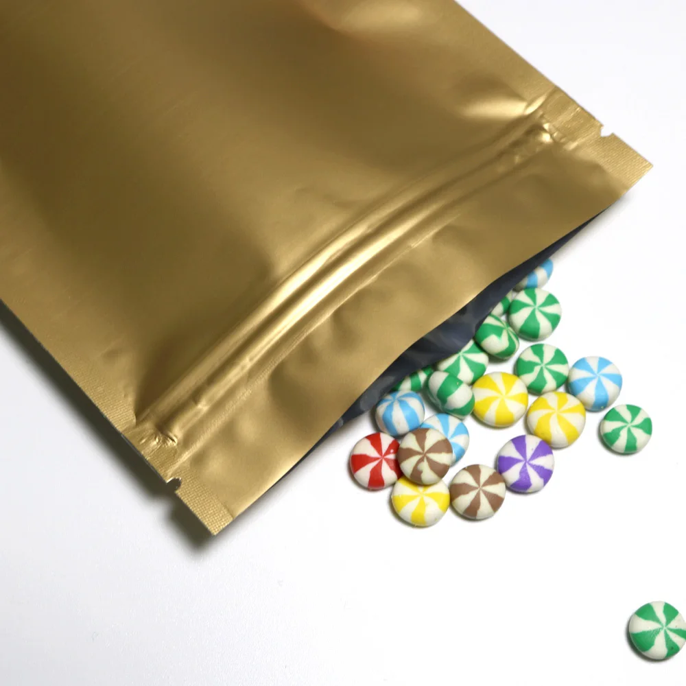 Экологичные высококачественные сумки-органайзеры для пищевых продуктов, матовые золотистые мешочки на молнии с зазубриной, термопечать, алюминиевая фольга, майларовые упаковочные пакеты