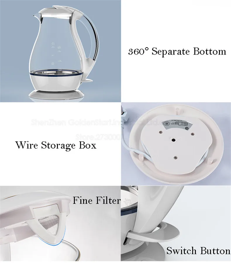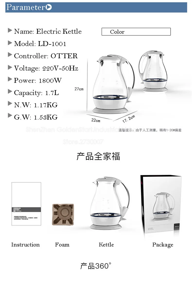Название: Электрический чайник Модель: LD-K1001 Напряжение: 220 В/50 Гц Мощность: 1800 Вт Емкость: 1.7л Длина провода: 75 см Материал: бокал высокого бора + нержавеющая сталь марки 304 Размер: 22 см * 17,2 см * 27 см