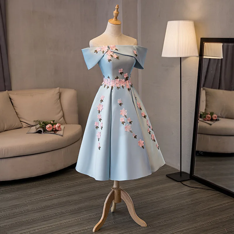 В наличии с открытыми плечами короткий рукав Vestido De Formatura атласное с бисером Цветы бальное платье Короткое вечернее платье Выпускное Платье