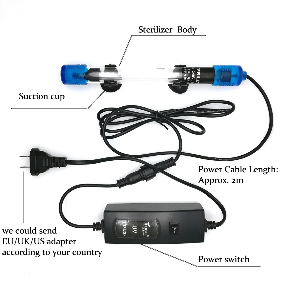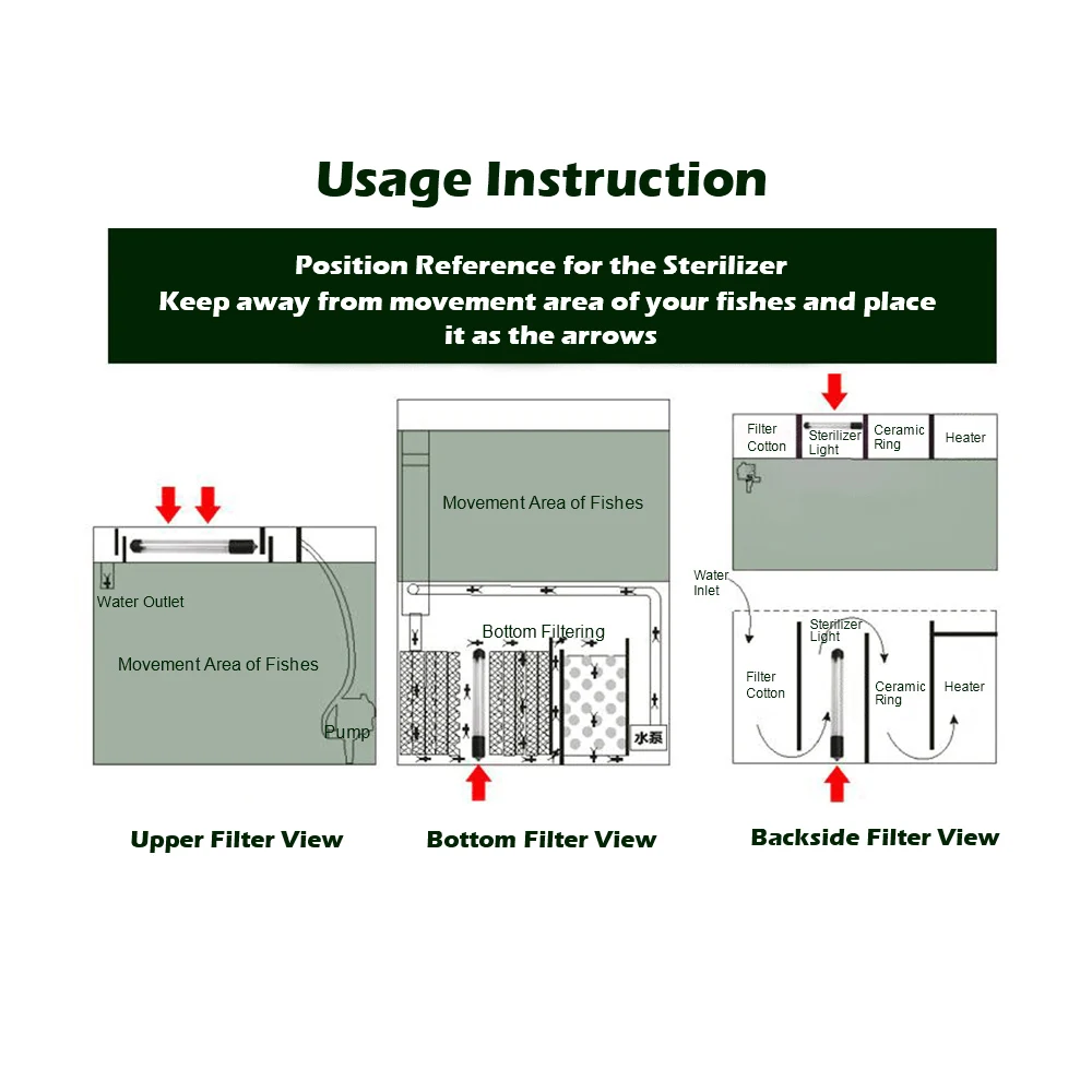 1. стерилизатор должен быть помещен в фильтр-бак, не может поместить его в аквариум для рыбы напрямую.