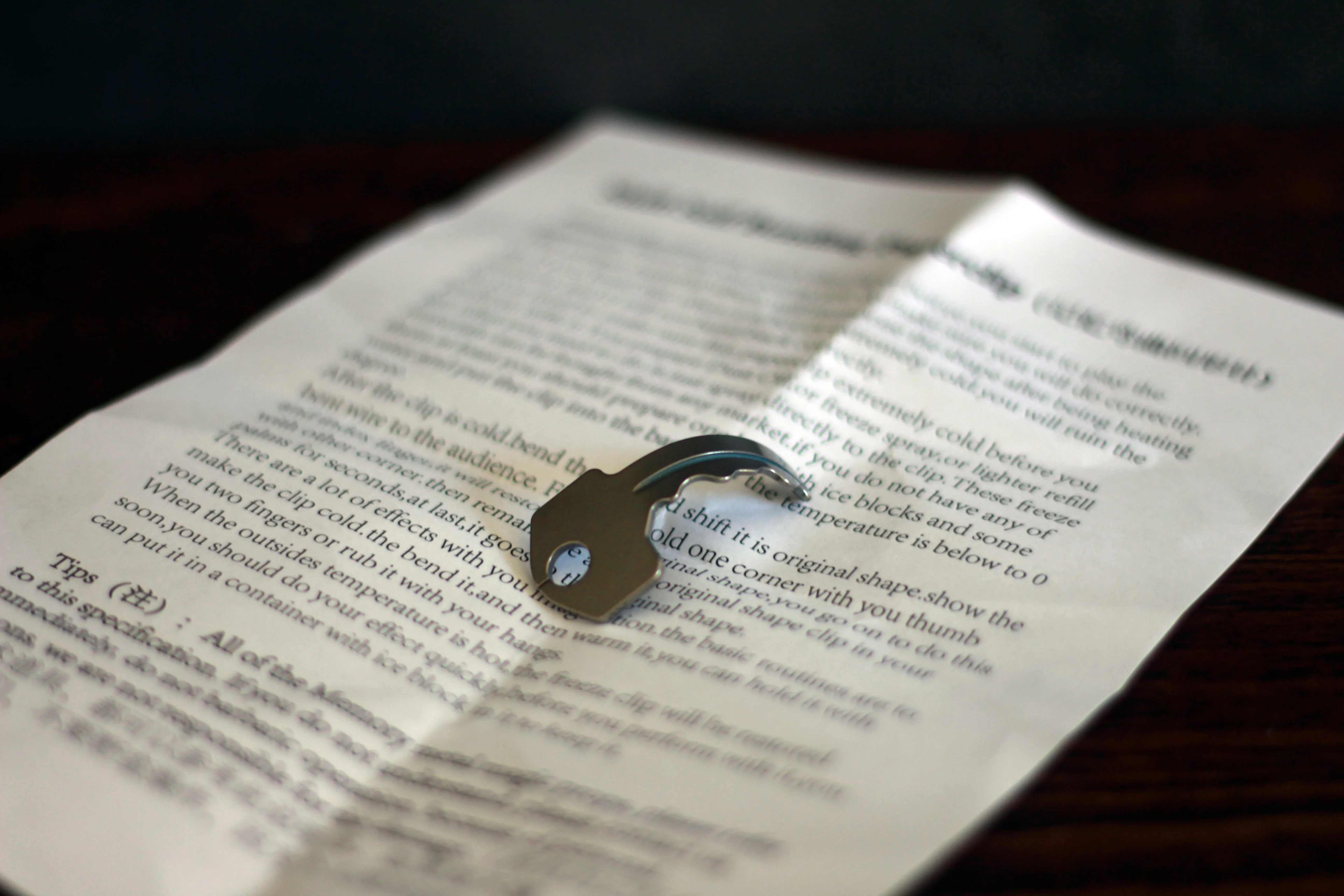У вас есть несколько ключей. Один выбирается зрителем. Загадочно в невозможных условиях, он сгибается в руках. Согнув, он не может сгибать его назад. Затем, вы берете его только кончиками пальцев: ключ выпрямляется в полный обзор! Вы немедленно передаете его своему владельцу.